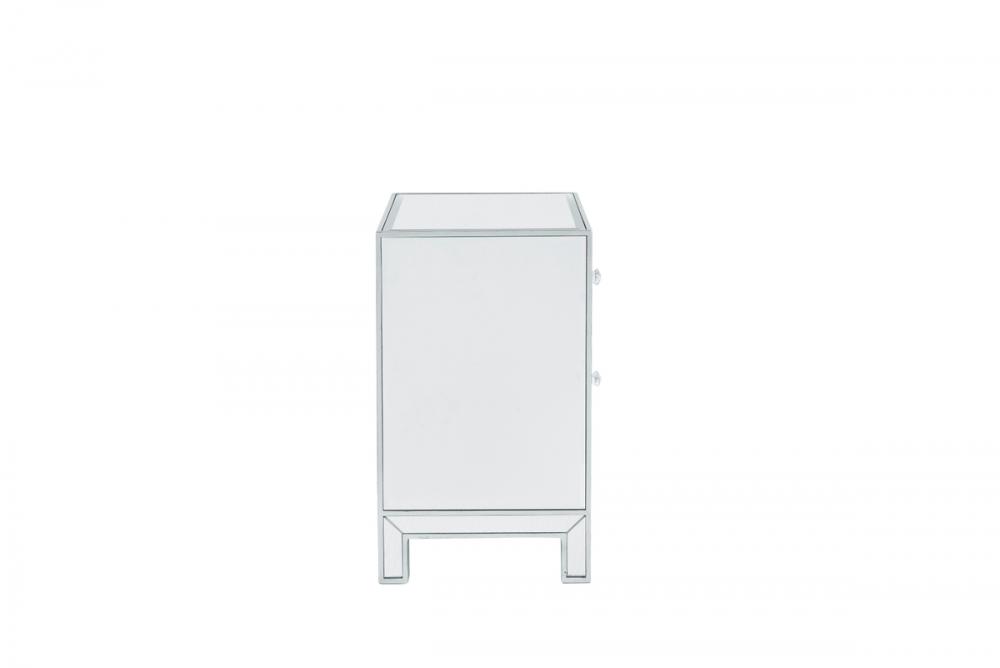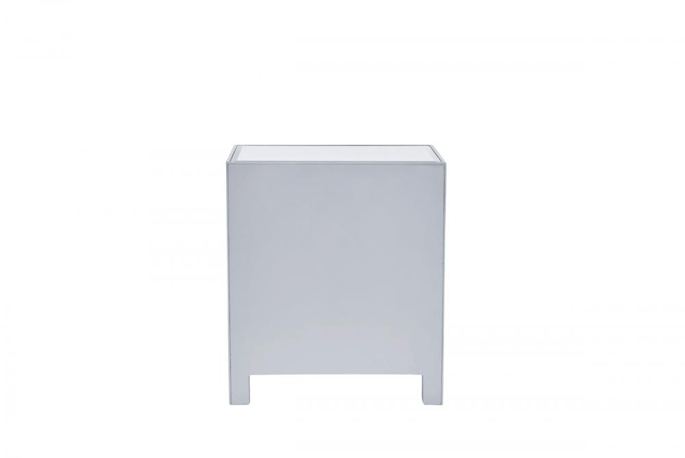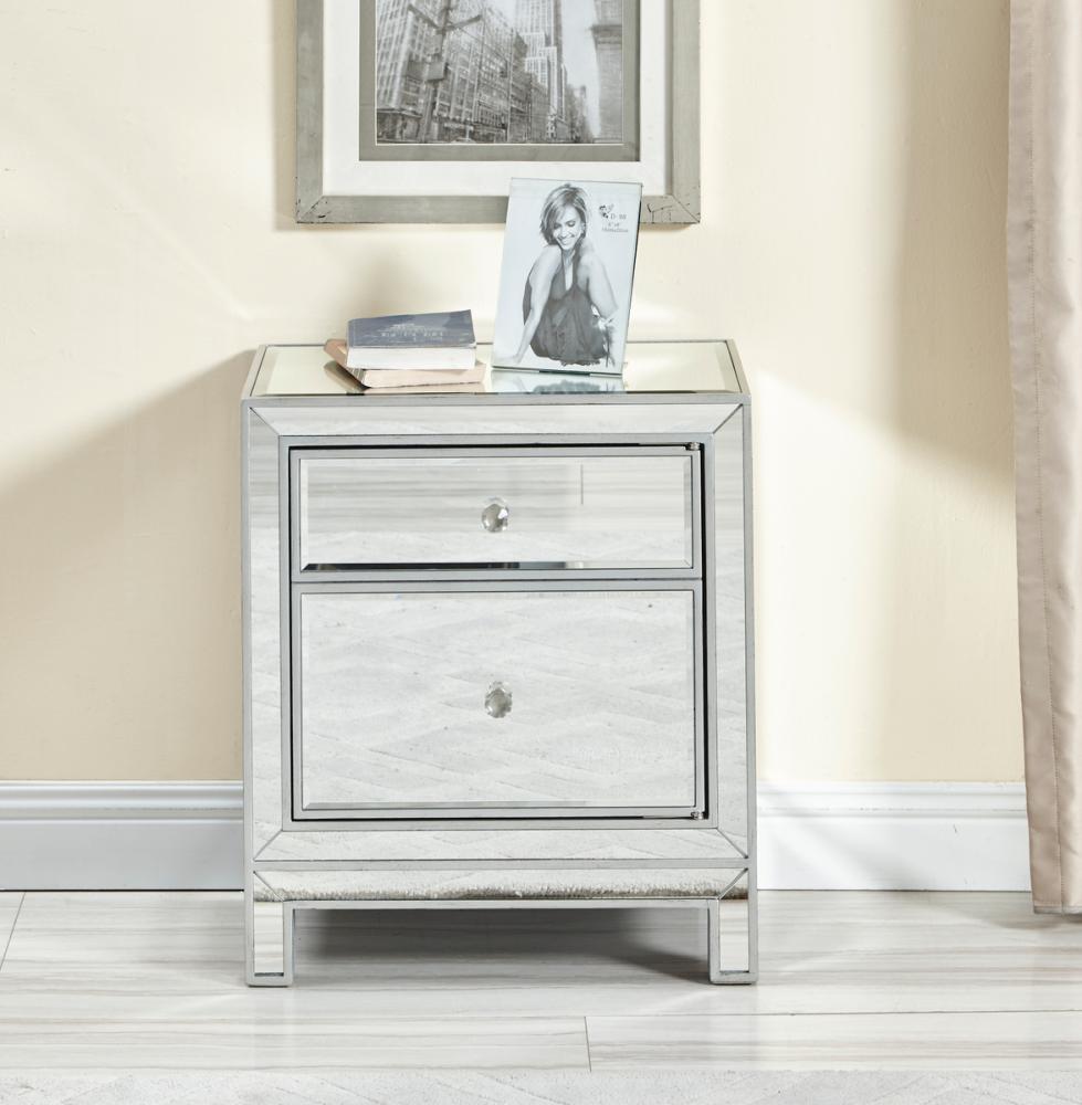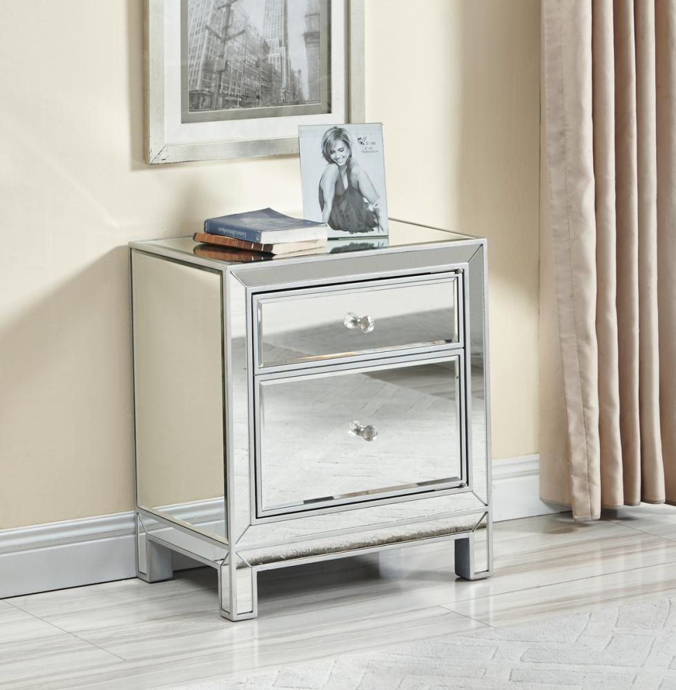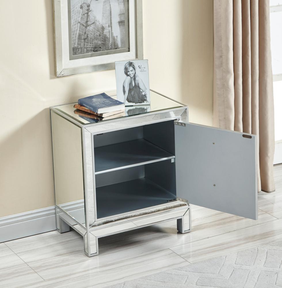 With its sleek lines and contemporary reflective appeal, this cabinet brings elegance and glamour. It provide ample storage space with strong shelving, jewel like crystal knobs, top quality mirror surfaces, and distinctive mitered corners. It combines function and style for any room in your home. FEATURES: *Reflexion collection *1 door *Storage shelf *crystal door knobs *Hand rubbed silver finish *Beveled mirror panel *Solid wood trim and legs *Inside lining painted in silver PRODUCT DETAILS: Measurement L24xW16xH26” *No assembly required *Material in kiln-dried solid wood and engineered wood * 1 year limited warranty.