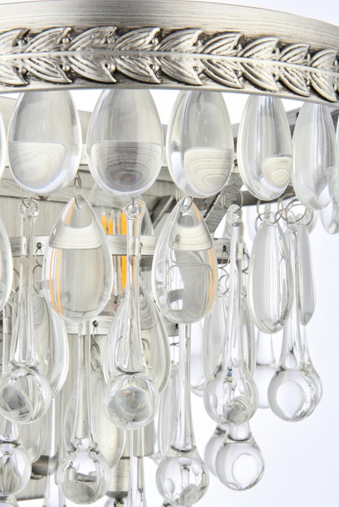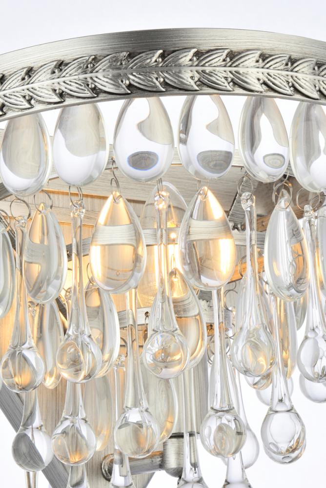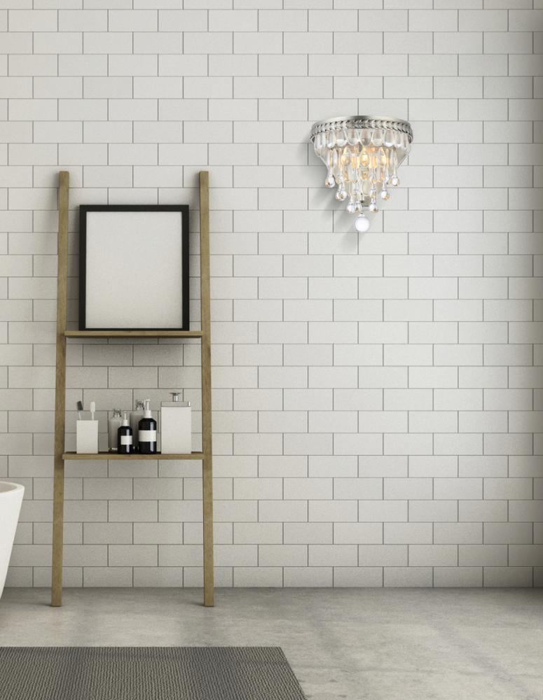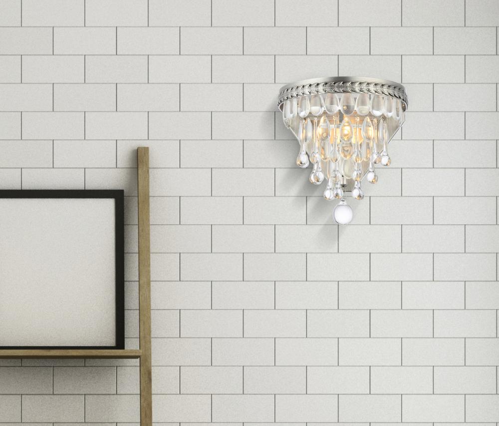Nordic wall sconces glimmer like droplets of ice on bright winter day. Tiers of clear, royal-cut crystals reflect the soft glow of the candelabra bulb inside. An etched antique-Silver frame complements the glistening layers below.