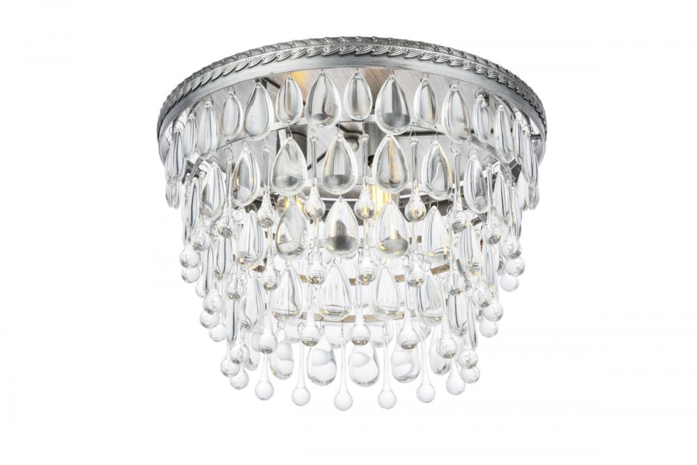 Like icicles reflecting the winter sun, Nordic flush-mount fixtures glisten with royal-cut clear crystal drops illuminated by the soft glow of candelabras. An etched frame base of antique silver bands the descending tiers of icy crystals.