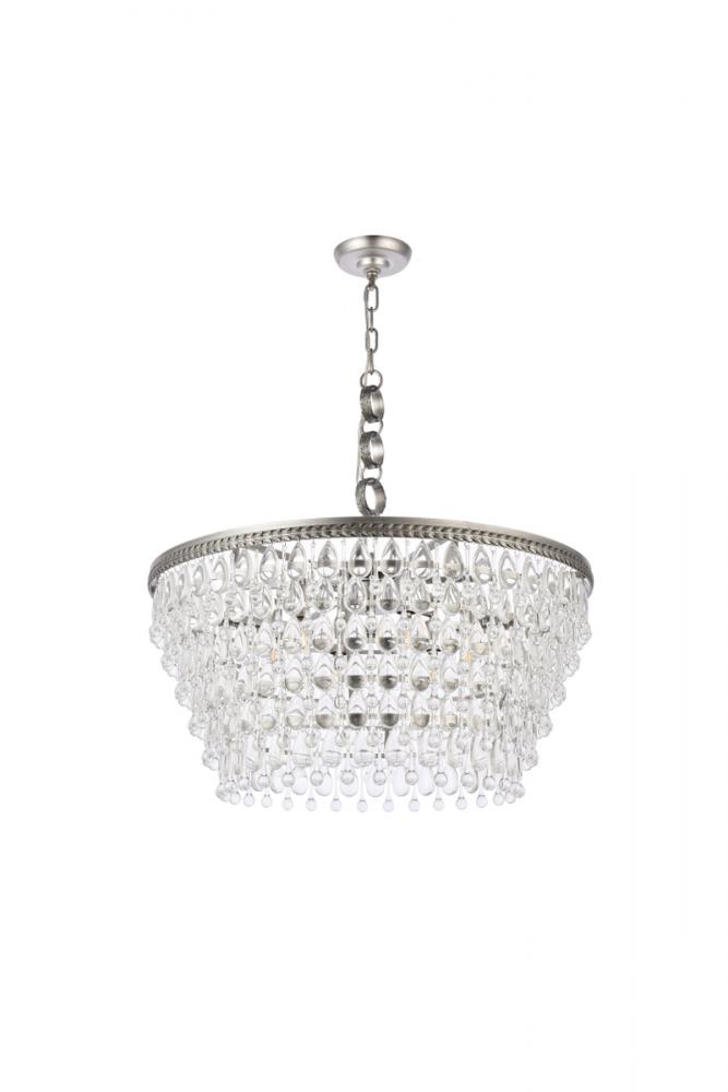 Like the sun setting on a frozen lake, this collection shimmers with tiers of icy crystals reflecting the soft glow of the candelabras. True to its Nordic namesake, the cascades of royal-cut clear crystals complement the etched antique-Silver-finished frame. Suspended by an elegantly looped chain that draws the eye to the cool sheen below.