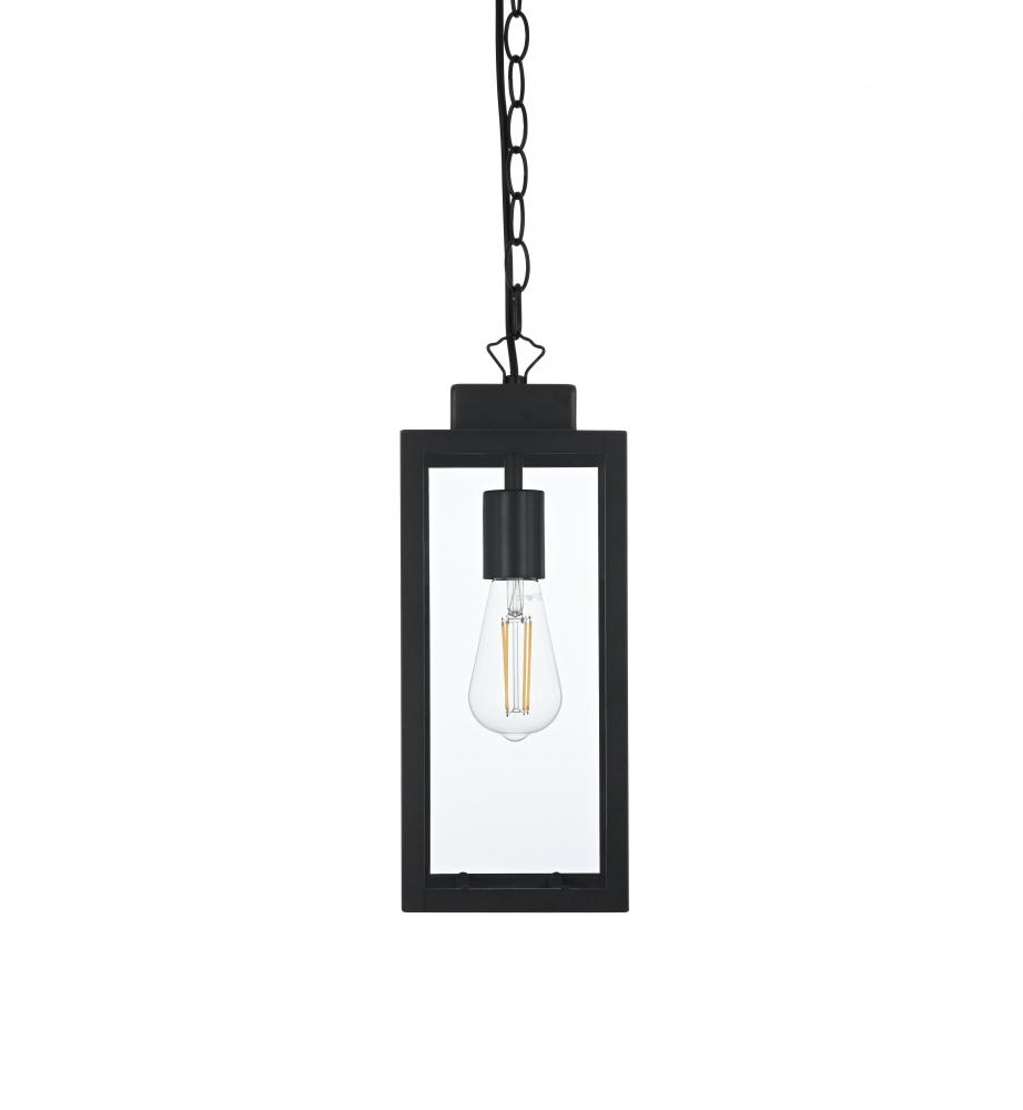 Add a modern yet timeless accent to your outdoor living space with this sleek rectangular pendant light. Featuring an elegant matte black finish and framed by clear glass panels, this pendant provides a bright, welcoming glow perfect for illuminating your porch, patio, or entryway. The visible bulb design lets you add a personal touch by showcasing a stylish filament bulb, enhancing the fixture’s overall aesthetic. Built with durable, weather-resistant metal and certified for wet locations, this pendant is ideal for a range of outdoor conditions. The adjustable chain allows you to customize the height, making it versatile for any space. Elevate your home’s curb appeal with this elegant outdoor pendant light that combines style, quality, and functionality.