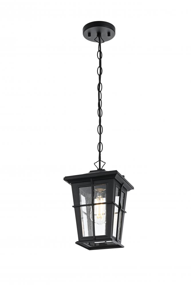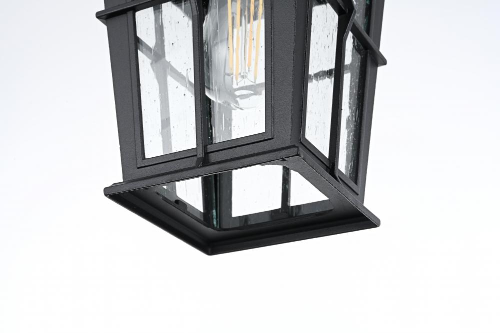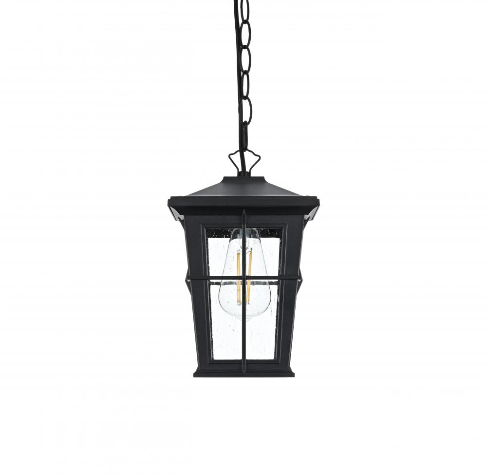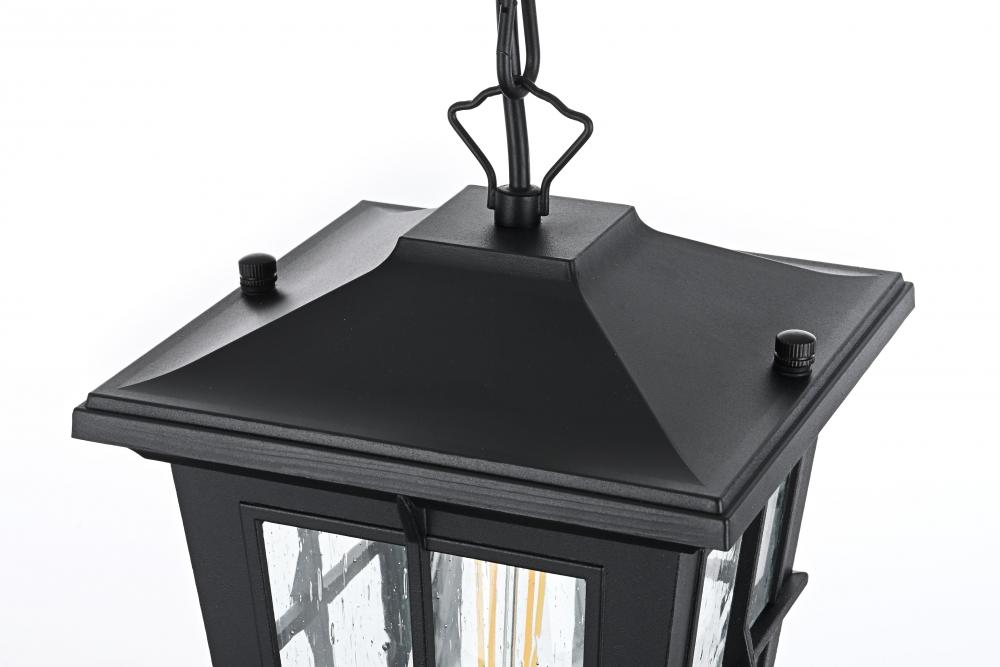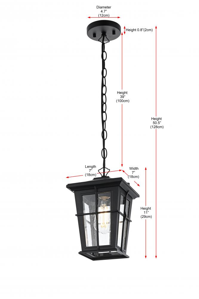 Bring classic elegance and warm illumination to your outdoor space with this stunning lantern-style pendant light. The timeless lantern silhouette is enhanced with stylish metal strap details, giving it a vintage yet sophisticated charm that enhances any home exterior. The clear seeded glass panels softly diffuse light, creating a welcoming ambiance for porches, patios, or entryways. Its matte black finish complements various outdoor styles, from traditional to modern. The pendant’s visible bulb adds an extra layer of character—perfect for those who love the classic Edison bulb look. Crafted from durable, weather-resistant metal and featuring an open-bottom design for easy bulb changes, this pendant light is built to last. The adjustable chain offers customizable hanging options, while ETL certification ensures safety and reliability for wet outdoor locations.