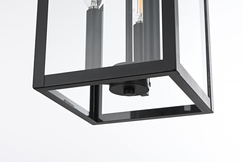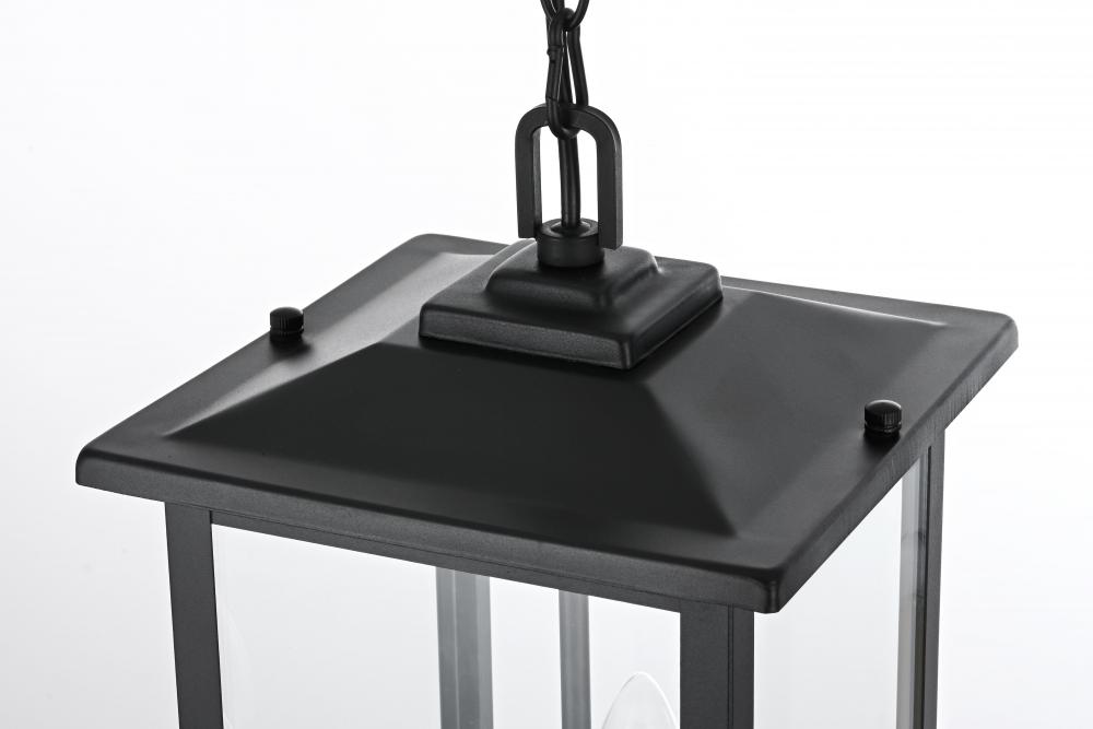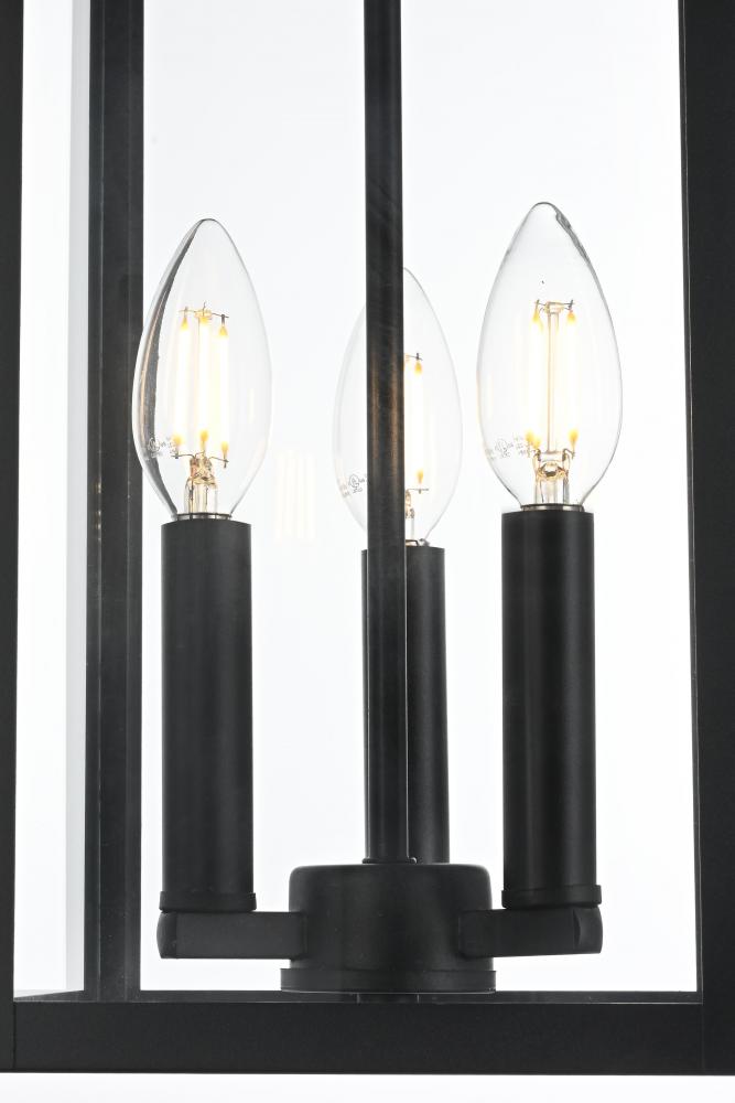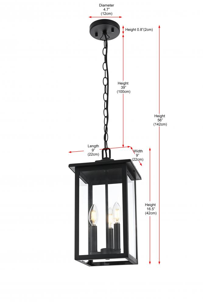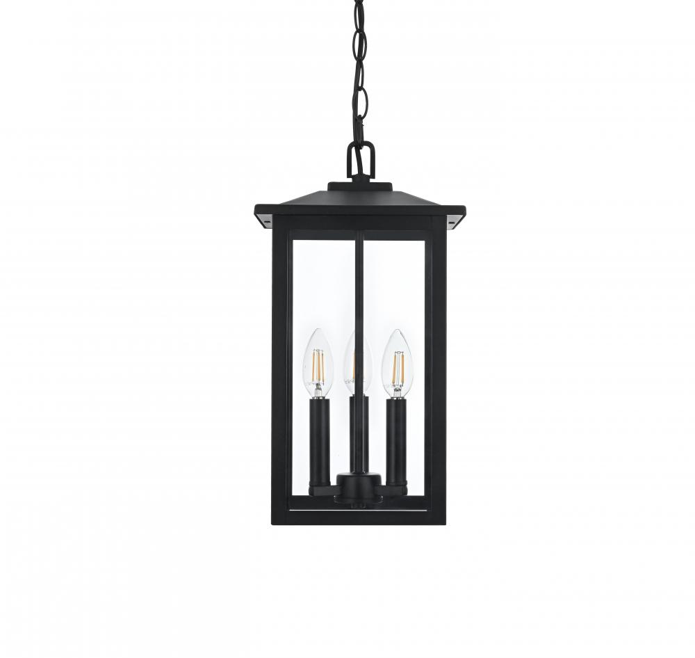 Add a touch of timeless charm to your outdoor living spaces with this elegant outdoor pendant light. Featuring a classic lantern silhouette with four clear glass panels, this pendant creates a bright, inviting glow that is perfect for patios, porches, or entryways. The three candelabra-style bulb holders offer a traditional touch, evoking the look of vintage lanterns while still fitting seamlessly into modern settings. Finished in matte black, this pendant light provides a versatile aesthetic that complements a variety of decor styles. Constructed with durable metal and ETL rated for wet locations, this light is built to withstand outdoor conditions, ensuring long-lasting performance. The adjustable hanging chain makes it easy to tailor the height for a perfect fit, enhancing both the beauty and functionality of your outdoor space.