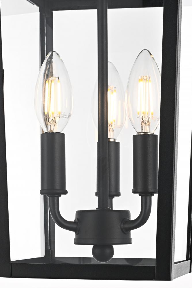 Create a warm, inviting glow in your outdoor spaces with this stylish pendant light. Featuring a classic lantern-style frame made from durable iron, this light brings a timeless touch to any outdoor area. The three-light configuration housed within clear glass panels allows for ample illumination, perfect for entryways, patios, and other covered outdoor locations. Damp rated for added versatility, this pendant light is well-suited to covered areas that may be exposed to humidity. The adjustable chain provides flexibility for hanging at just the right height, and the simple round canopy offers easy installation. Designed with E12 sockets, this pendant allows you to personalize your lighting with bulbs of your choice (sold separately). with its classic black finish and sturdy construction, this outdoor pendant light is a great way to enhance your exterior decor while adding a bright, welcoming atmosphere.
