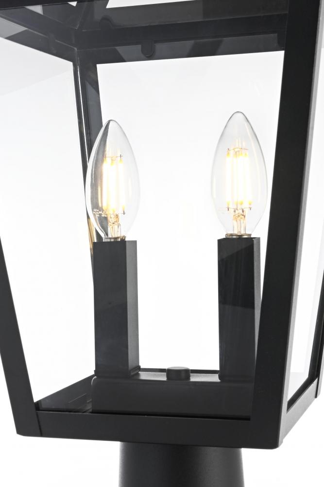 This outdoor post light is a beautiful embodiment of modern and classic design that perfectly complements any exterior home setting. Constructed from sturdy iron and clear glass, the light combines sharp architectural lines with a timeless lantern style, resulting in a statement fixture that enhances curb appeal. The angular matte black frame, topped by a stylish triangular loop, embraces an open, trapezoid-shaped structure with clear glass panels that reveal two E12 candelabra sockets. These sockets provide the ideal opportunity to incorporate flame-shaped bulbs for a warm, welcoming ambiance. Its classic look ensures versatility, making it a perfect addition to walkways, gardens, or patio posts, adding light where needed.