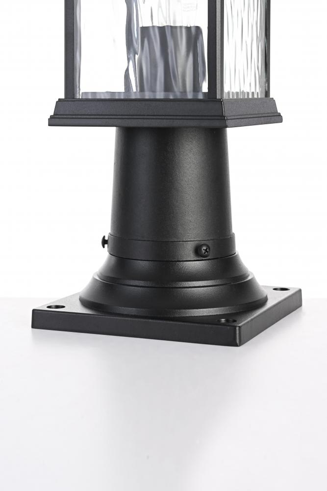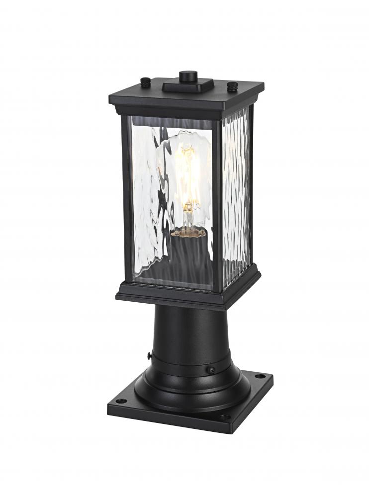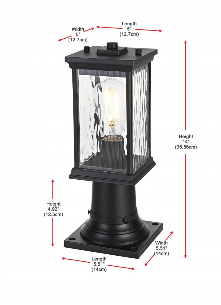 This outdoor post light brings an instant touch of sophistication to your exterior décor. Crafted with an aluminum frame, the design features a distinctive rectangular shape with slightly flared accents at the top and bottom for added visual interest. The rippled glass panels enclose an E26 socket, designed to accommodate a traditional Edison-style bulb, which casts a warm and inviting glow. The combination of a sturdy aluminum frame and the rippled glass texture creates a timeless aesthetic, perfect for creating a cozy ambiance on porches, entryways, or patios. Its matte black finish ensures this post light can seamlessly blend into modern, farmhouse, or transitional styled homes, while the durable construction ensures that it stands the test of weather and time.