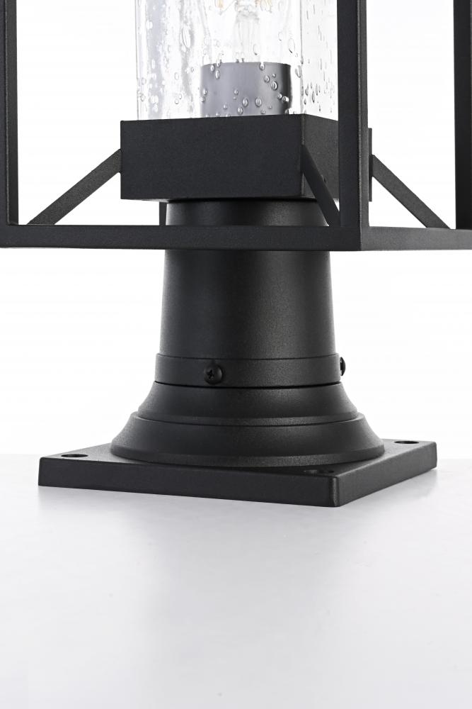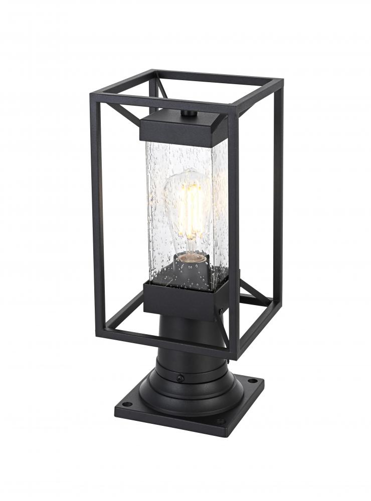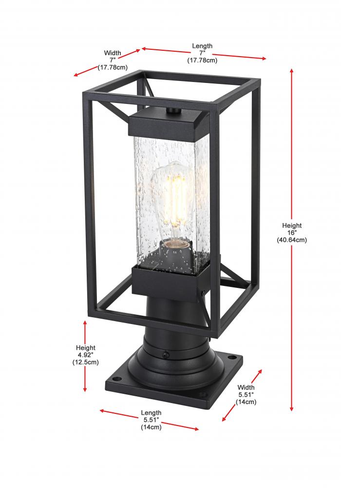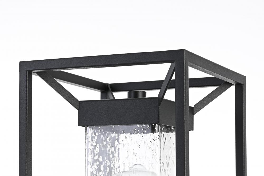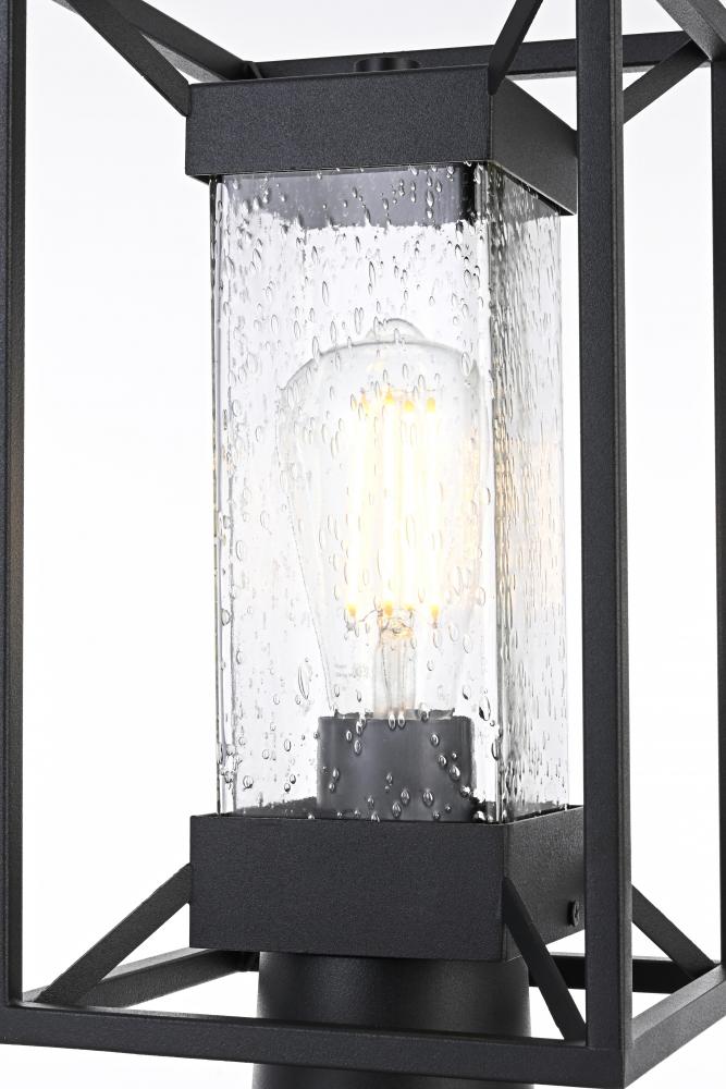This outdoor post light blends modern simplicity with timeless charm. The sturdy iron frame is designed in a geometric shape, beautifully housing the clear seeded glass that allows the warm glow of the light to shine through. The clear seeded glass adds texture to the illumination, creating an inviting and sophisticated glow that transforms the exterior of your home. with an E26 socket base that easily accommodates standard bulbs, this fixture not only provides style but also high functionality. Whether flanking your front door or lighting up your patio, this post light elevates your outdoor space with a crisp, contemporary look that is both durable and refined.