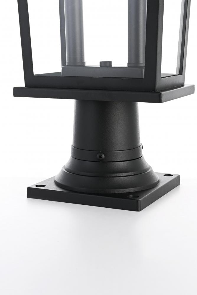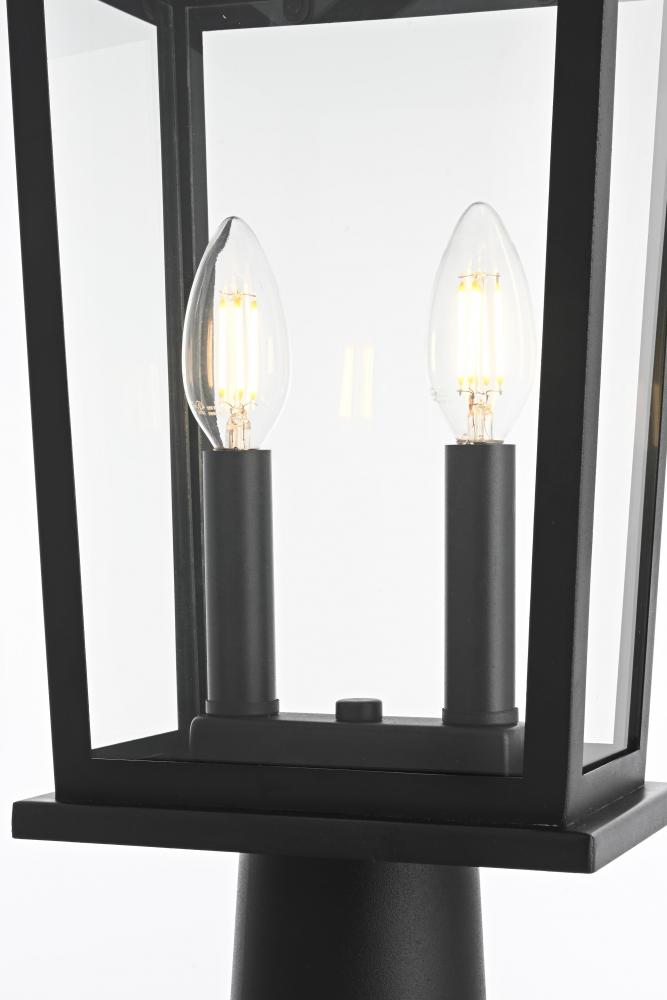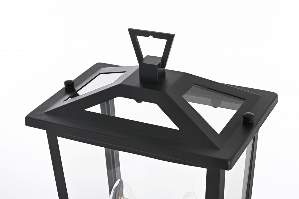 Enhance your outdoor space with this stylish post light that features a striking matte black frame paired with clear glass panels, perfectly showcasing its modern charm. The latern box shape is adorned with a distinctive triangular loop on top, adding a unique architectural touch that seamlessly combines functionality with a bold, sleek aesthetic. The open bottom design allows for easy bulb changes and casts a beautiful downward light, adding a welcoming glow to your entrance or patio area. Crafted from durable iron with a clean, modern style, this post light is perfect for those who appreciate a blend of simplicity and contemporary design. The clear glass ensures maximum light output, enhancing visibility while emphasizing the beautiful shape of the bulb inside. The E12 socket offers versatility for different bulb styles, allowing you to easily customize the ambiance of your outdoor area.