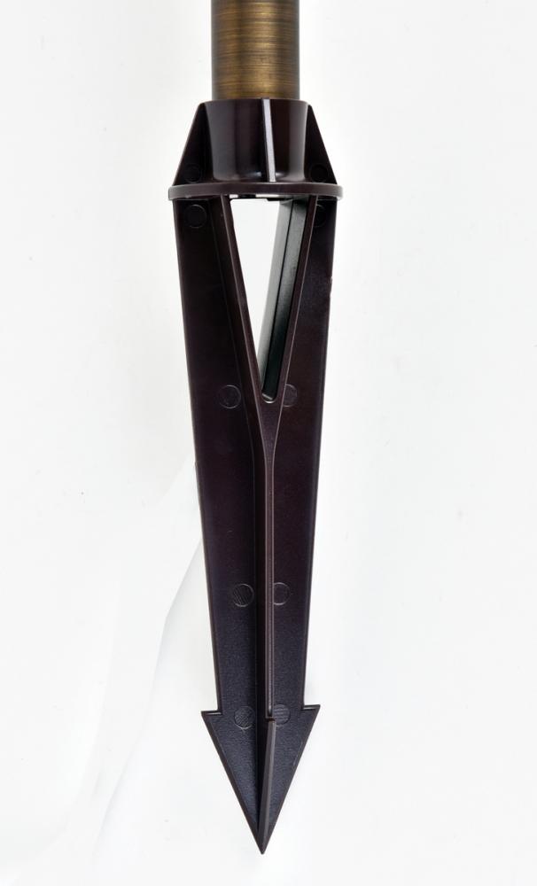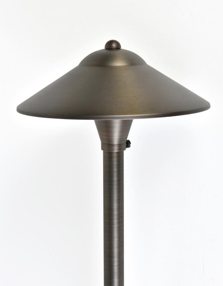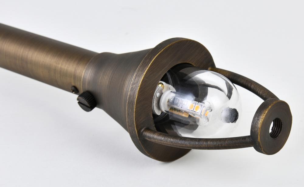 Inspired by the species of brightly-colored mushrooms, Chanterelle path lights create the perfect mood lighting for your evening stroll. The spinning brass frame in an antique-brass finish features an eight-inch spike for stability. with matching brass shade, the entire fixture stands 24 inches tall and requires a 20-watt G4 halogen bulb (not included). Ideal for brightening a dark driveway, front entrance, or a garden path.