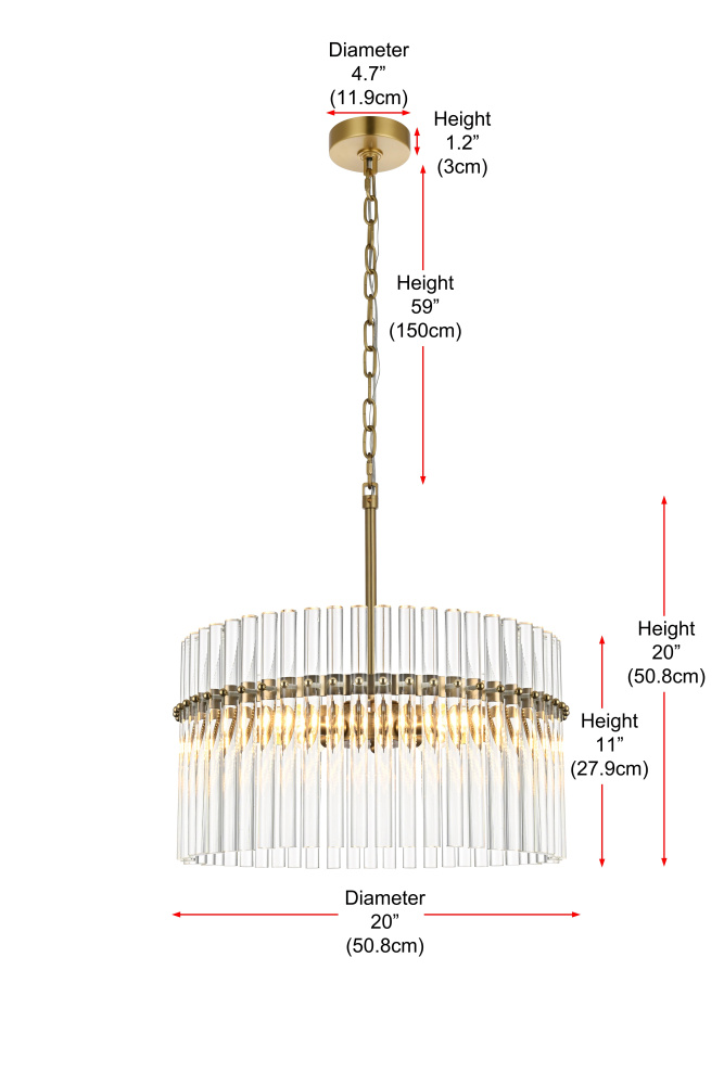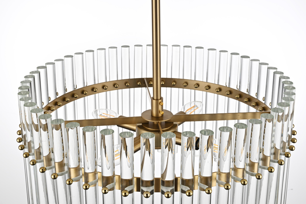 Illuminate spaces with a stunning display of light and clarity, beautifully captured in this glass-rod pendant. Evenly spaced clear glass rods encircle the structured iron frame, ensuring a symmetrical balance that radiates brilliance from every angle. The polished nickel finish enhances the sleek, modern aesthetic, while the satin gold option infuses warmth and refinement into contemporary and transitional interiors. Designed with four E12 sockets (bulbs not included), this pendant offers a bright and inviting ambiance, adjustable through its dimmable functionality. With an adjustable drop ranging from 24 to 85 inches, the included 59-inch chain allows for versatile placement, making it an ideal choice for dining rooms, living areas, or office spaces. Paired with a matching canopy and chain for a cohesive finish, this pendant embodies modern sophistication with a luminous touch.