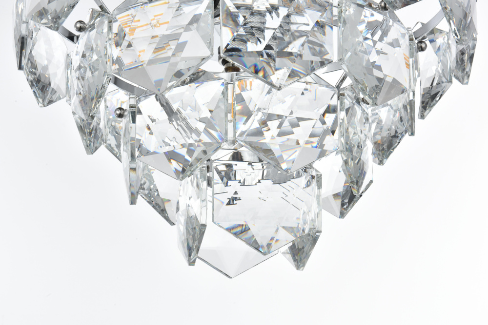 Features a stunning multi-tier arrangement of faceted crystals cascading down, creating a layered, dynamic visual effect that draws the eye and adds depth to any room.