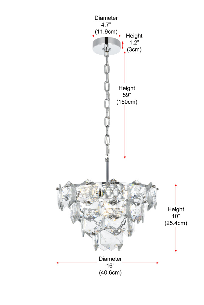 Transform your space with this cascading multi-tier pendant light that combines striking design with meticulous craftsmanship. Crafted from a sturdy iron frame and adorned with six-sided faceted crystals, this lighting piece exudes charm through its ability to diffuse light into a soft, radiant glow. With finishes available in both sleek chrome for a contemporary feel and satin gold for a warmer, refined touch, it complements a range of decor styles. The adjustable height, from 19 inches to 79 inches with the included 59-inch chain, ensures it fits seamlessly in any setting. Equipped with six E12 sockets and dimmable functionality, you can customize the lighting to suit your mood or occasion. Its matching canopy and chain finish complete the cohesive design, making it perfect for kitchens, dining rooms, living rooms, or offices. A statement piece that transforms your space into a work of art, this pendant is the perfect blend of style and functionality.