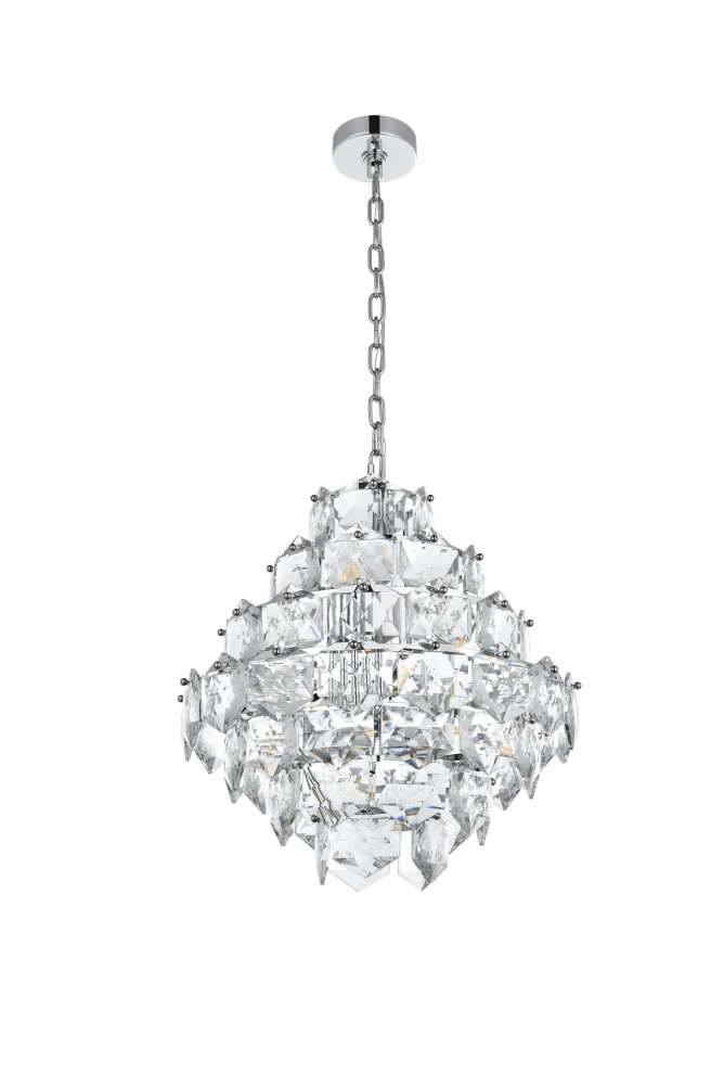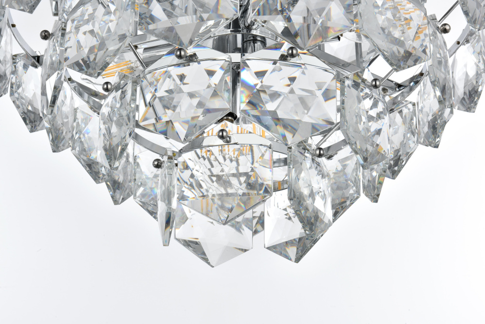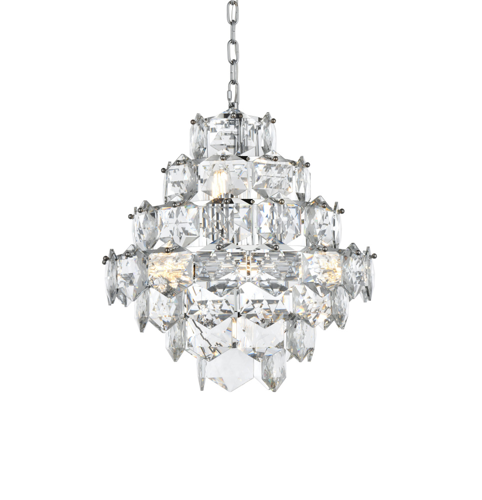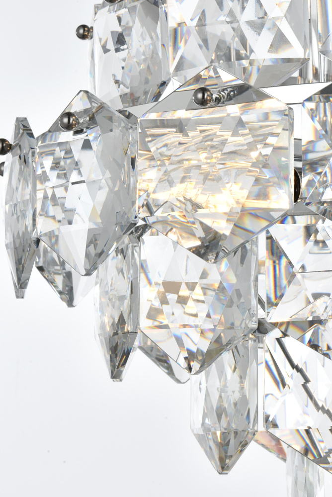 Adorned with six-sided, precision-cut crystals, each tier cascades down to create a radiant play of light and dimension.