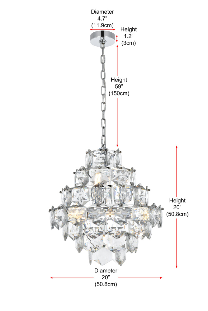 Transform your space with this cascading multi-tier pendant light that combines striking design with meticulous craftsmanship. Crafted from a sturdy iron frame and adorned with six-sided faceted crystals, this lighting piece exudes charm through its ability to diffuse light into a soft, radiant glow. With finishes available in both sleek chrome for a contemporary feel and satin gold for a warmer, refined touch, it complements a range of decor styles. The adjustable height, from 29 inches to 89 inches with the included 59-inch chain, ensures it fits seamlessly in any setting. Equipped with eleven E12 sockets and dimmable functionality, you can customize the lighting to suit your mood or occasion. Its matching canopy and chain finish complete the cohesive design, making it perfect for kitchens, dining rooms, living rooms, or offices. A statement piece that transforms your space into a work of art, this pendant is the perfect blend of style and functionality.