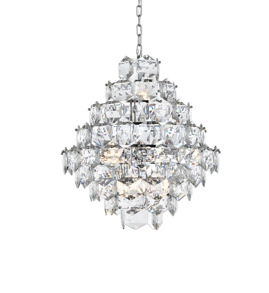 Transform your space with this cascading multi-tier pendant light that combines striking design with meticulous craftsmanship. Crafted from a sturdy iron frame and adorned with six-sided faceted crystals, this lighting piece exudes charm through its ability to diffuse light into a soft, radiant glow. With finishes available in both sleek chrome for a contemporary feel and satin gold for a warmer, refined touch, it complements a range of decor styles. The adjustable height, from 34 inches to 94 inches with the included 59-inch chain, ensures it fits seamlessly in any setting. Equipped with fifteen E12 sockets and dimmable functionality, you can customize the lighting to suit your mood or occasion. Its matching canopy and chain finish complete the cohesive design, making it perfect for kitchens, dining rooms, living rooms, or offices. A statement piece that transforms your space into a work of art, this pendant is the perfect blend of style and functionality.