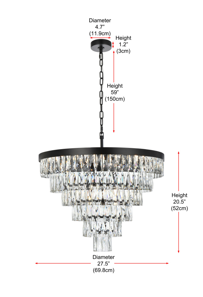 Transform your space with this extraordinary pendant that reimagines classical crystal design for contemporary interiors. The masterfully engineered silhouette features six graduating tiers that create a spectacular inverted pyramid, reminiscent of a frozen cascade captured in mid-descent. Each precisely cut rectangular crystal is strategically positioned to maximize light play, creating mesmerizing displays of fractured light throughout your space. The substantial scale makes this fixture an ideal centerpiece for grand entryways, sophisticated dining rooms, or executive offices. The thoughtful construction incorporates 13 light sources distributed throughout the tiers, ensuring both spectacular illumination and enchanting crystal animation. The robust iron framework provides a secure foundation while maintaining visual lightness, allowing the crystals to appear as if floating in space. Available in reflective chrome, sophisticated black, or warm satin gold, this pendant makes an unforgettable statement while maintaining refined restraint. The cascading arrangement creates a sense of movement and flow, while the geometric precision of each crystal adds contemporary edge to the classical form. This is more than a light fixture – it's an architectural feature that transforms your space through its commanding presence and spectacular light performanc