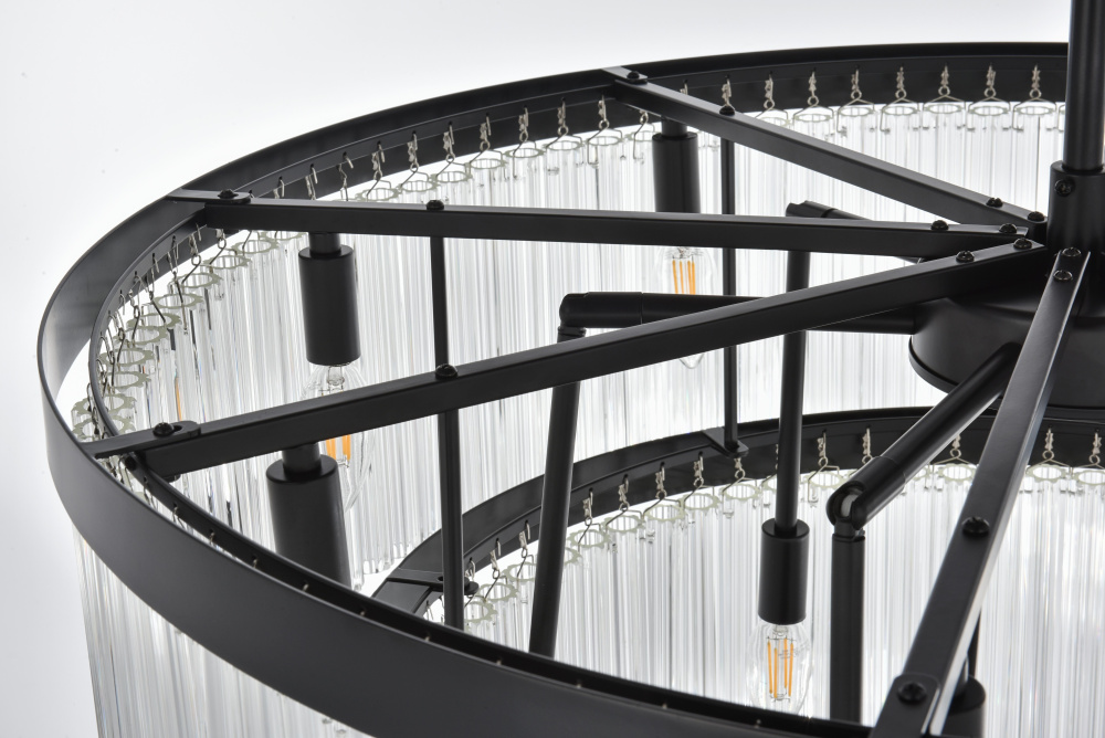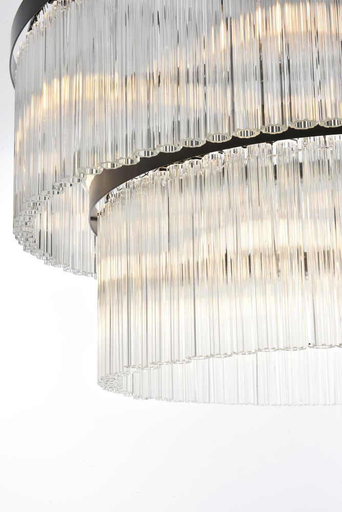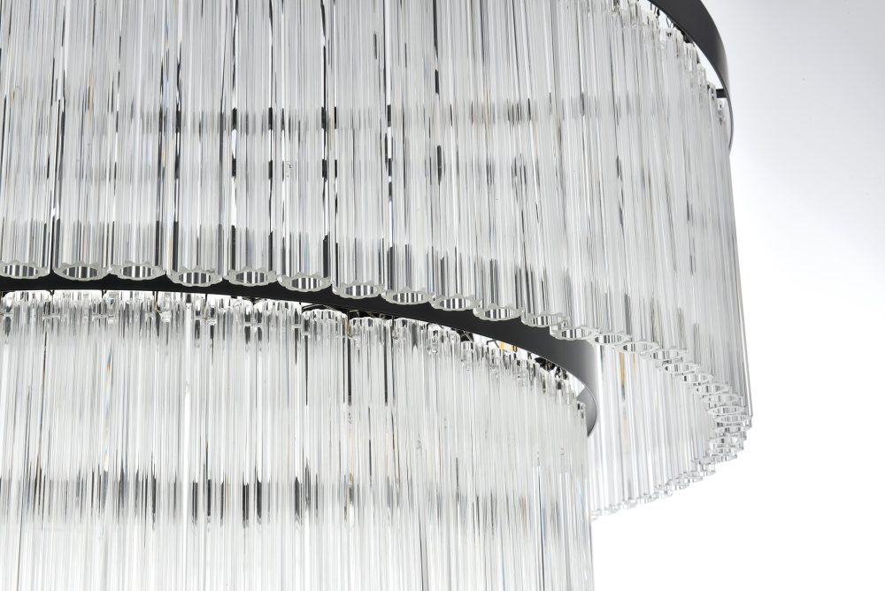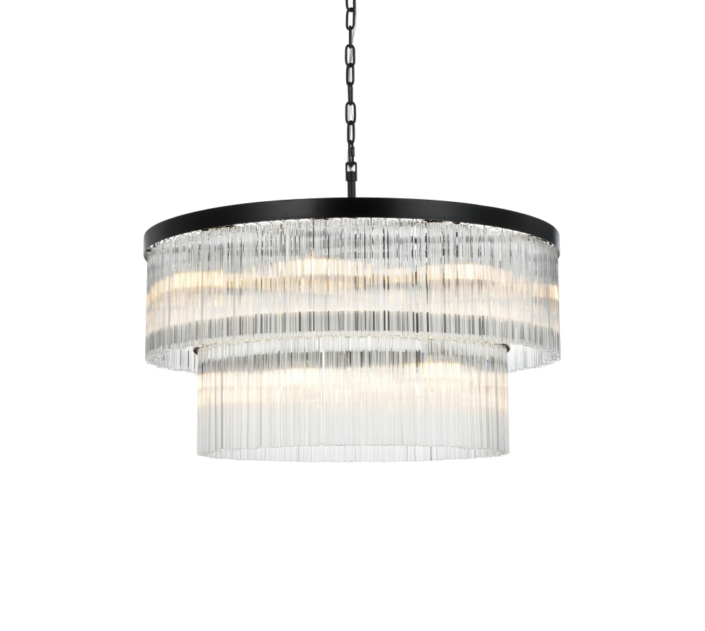 Turn your space into a glowing masterpiece with this striking pendant light, crafted from durable iron and shimmering clear ribbed glass. The cascading layers create a stunning interplay of light and shadow, refracting illumination into a radiant display that transforms your space into an illuminated work of art. Available in chrome for a sleek, contemporary aesthetic, black for bold contrast, and satin gold for an inviting warmth, this pendant light is as versatile as it is beautiful. Whether you choose a single tier for minimalist charm, two tiers for balanced depth, three tiers for bold presence, or four tiers for show-stopping grandeur, there’s an option for every setting. Featuring both round and rectangular frame designs, this fixture adapts to any space with ease. Complete with a matching canopy and chain, and fully dimmable for customized lighting, this pendant pairs perfectly with the coordinating single-tier flush mount and wall sconce collection, ensuring a cohesive, radiant design throughout youhome or office. Please note: light bulbs are sold separately.