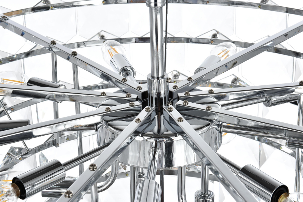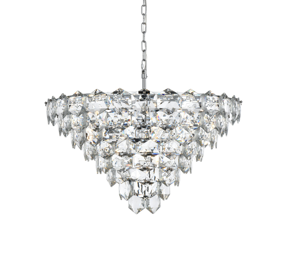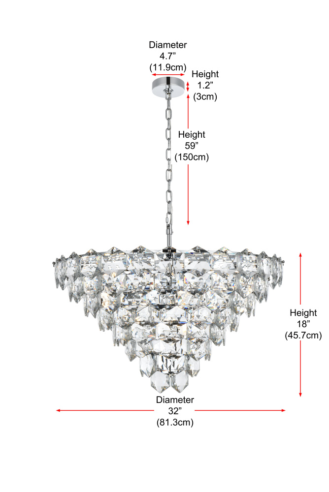 Transform your space with this cascading multi-tier pendant light that combines striking design with meticulous craftsmanship. Crafted from a sturdy iron frame and adorned with six-sided faceted crystals, this lighting piece exudes charm through its ability to diffuse light into a soft, radiant glow. With finishes available in both sleek chrome for a contemporary feel and satin gold for a warmer, refined touch, it complements a range of decor styles. The adjustable height, from 27 inches to 87 inches with the included 59-inch chain, ensures it fits seamlessly in any setting. Equipped with fifteen E12 sockets and dimmable functionality, you can customize the lighting to suit your mood or occasion. Its matching canopy and chain finish complete the cohesive design, making it perfect for kitchens, dining rooms, living rooms, or offices. A statement piece that transforms your space into a work of art, this pendant is the perfect blend of style and functionality.