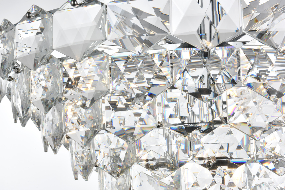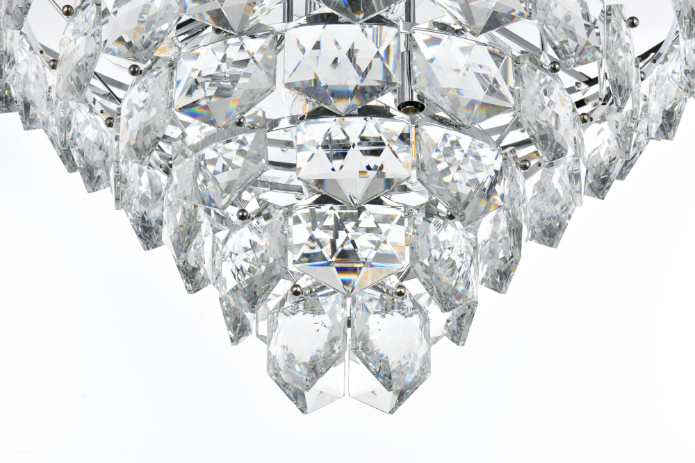 Features a stunning multi-tier arrangement of faceted crystals cascading down, creating a layered, dynamic visual effect that draws the eye and adds depth to any room.