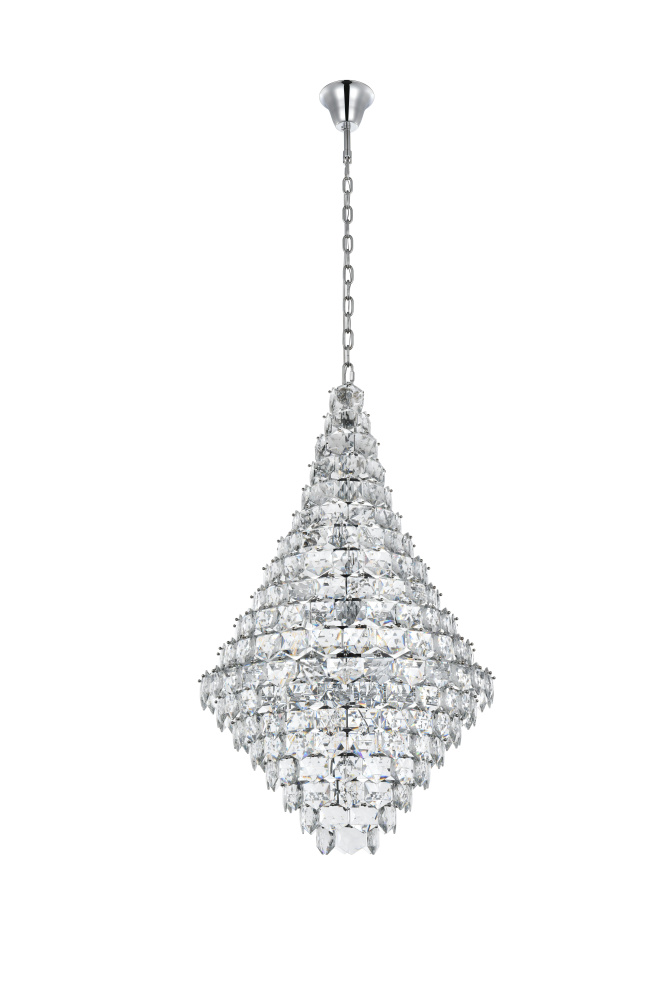 Make a bold statement with this stunning teardrop-shaped pendant light that combines architectural form with radiant details. The cascading multi-tier arrangement of six-sided faceted crystals creates a dazzling visual effect, beautifully diffusing light to enhance the ambiance of any room. Built with a durable iron frame and available in chrome for a sleek, contemporary edge or satin gold for a rich, inviting tone, this lighting fixture complements a range of decor styles. Its grand adjustable hanging height—from 75 inches to 135 inches—makes it ideal for spaces with high ceilings. With 38 E12 sockets (bulbs sold separately) and dimmable compatibility, it provides versatile lighting options tailored to your needs. The matching canopy and chain finish complete its cohesive design. Whether placed in a dining room, living room, office, or a grand foyer, this chandelier-style pendant transforms any space into a brilliant masterpi
