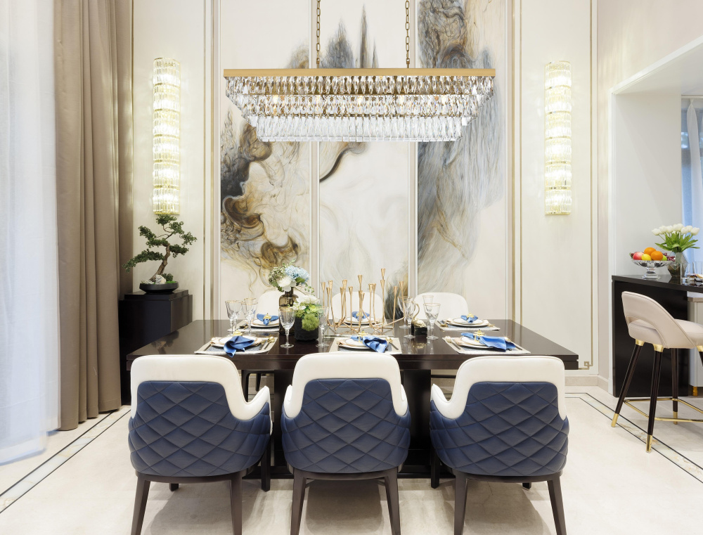 Three distinct crystal tiers form a stunning stepped silhouette beneath the linear frame.