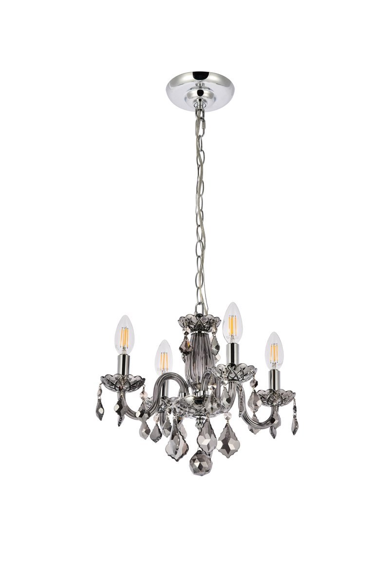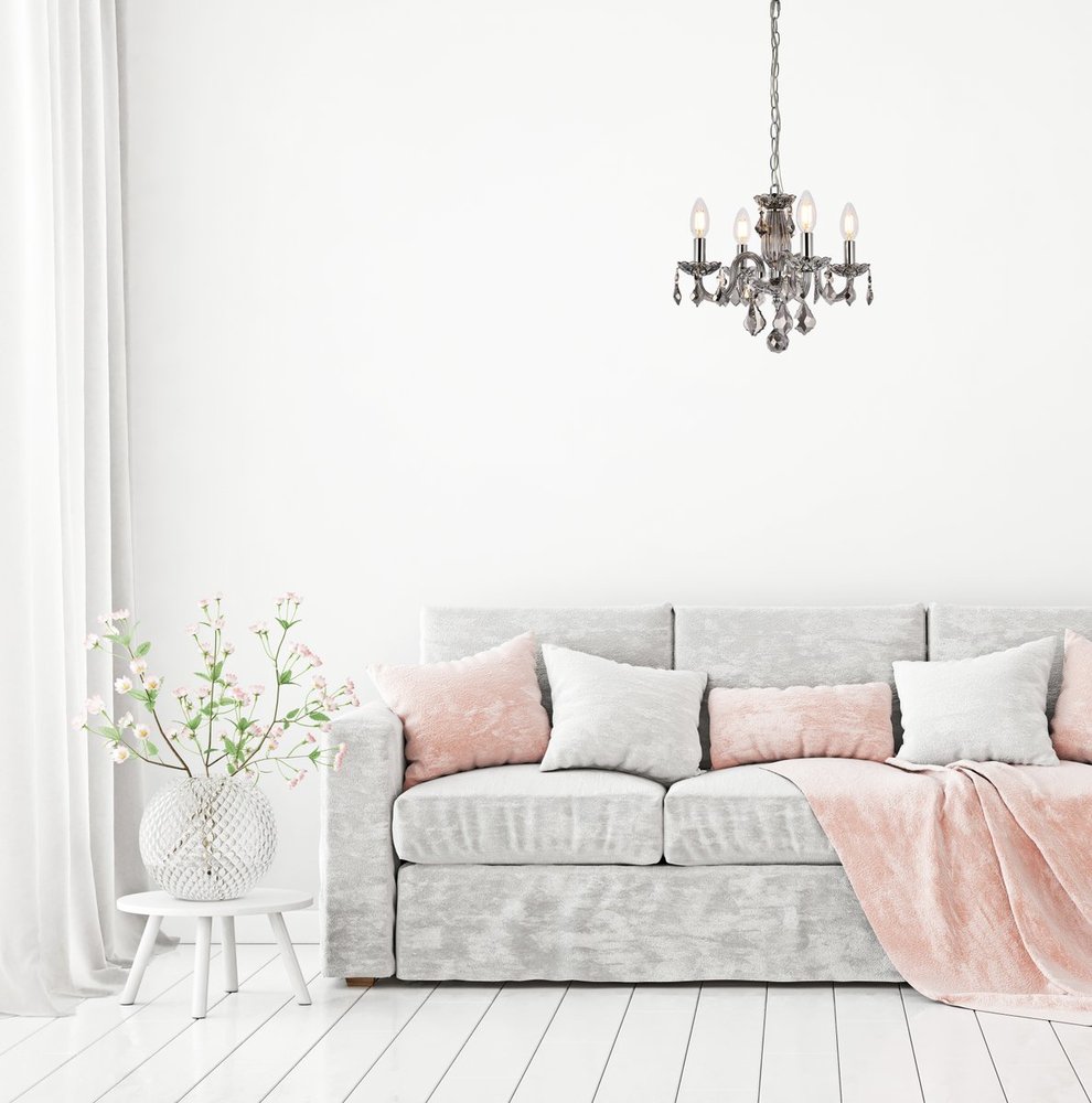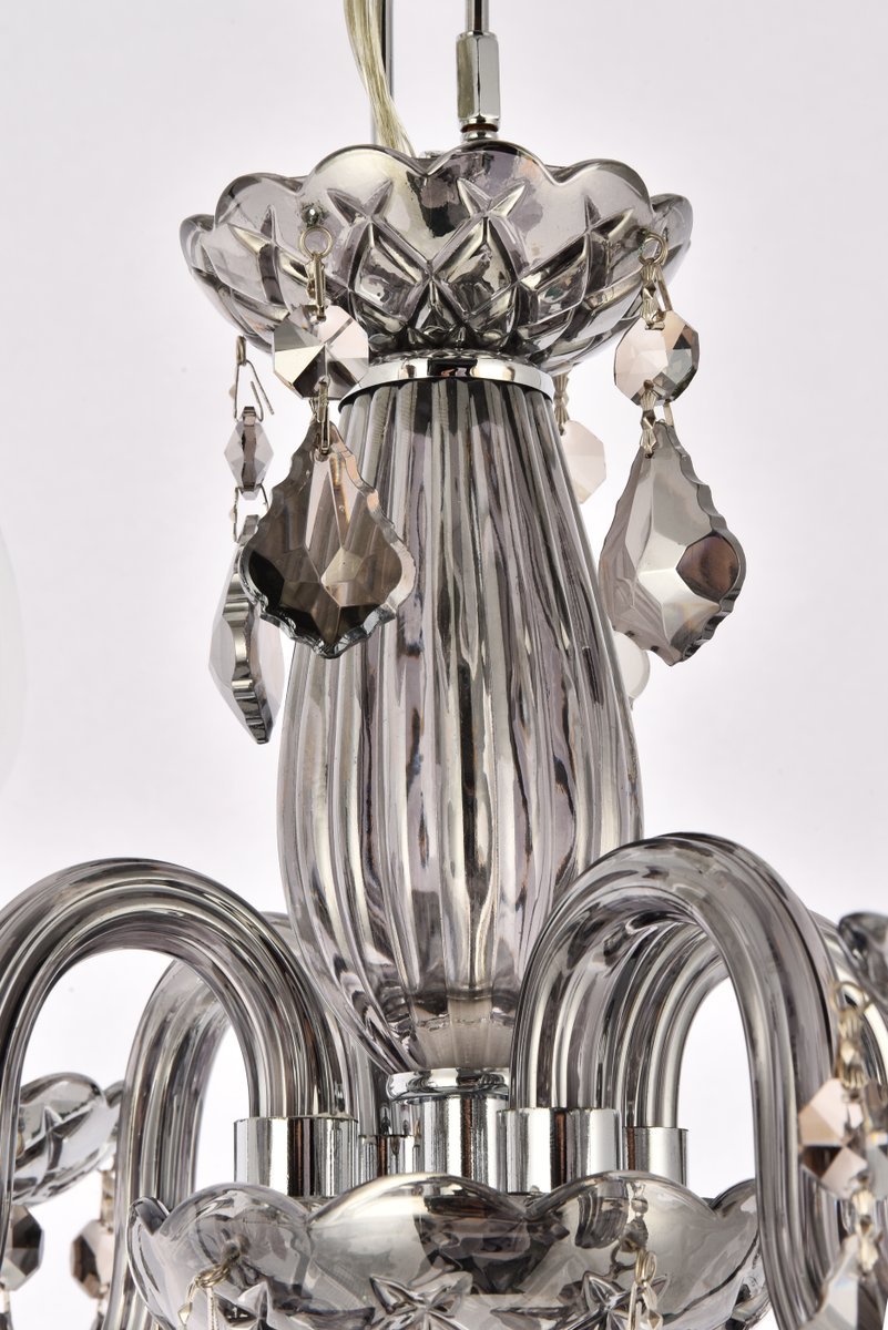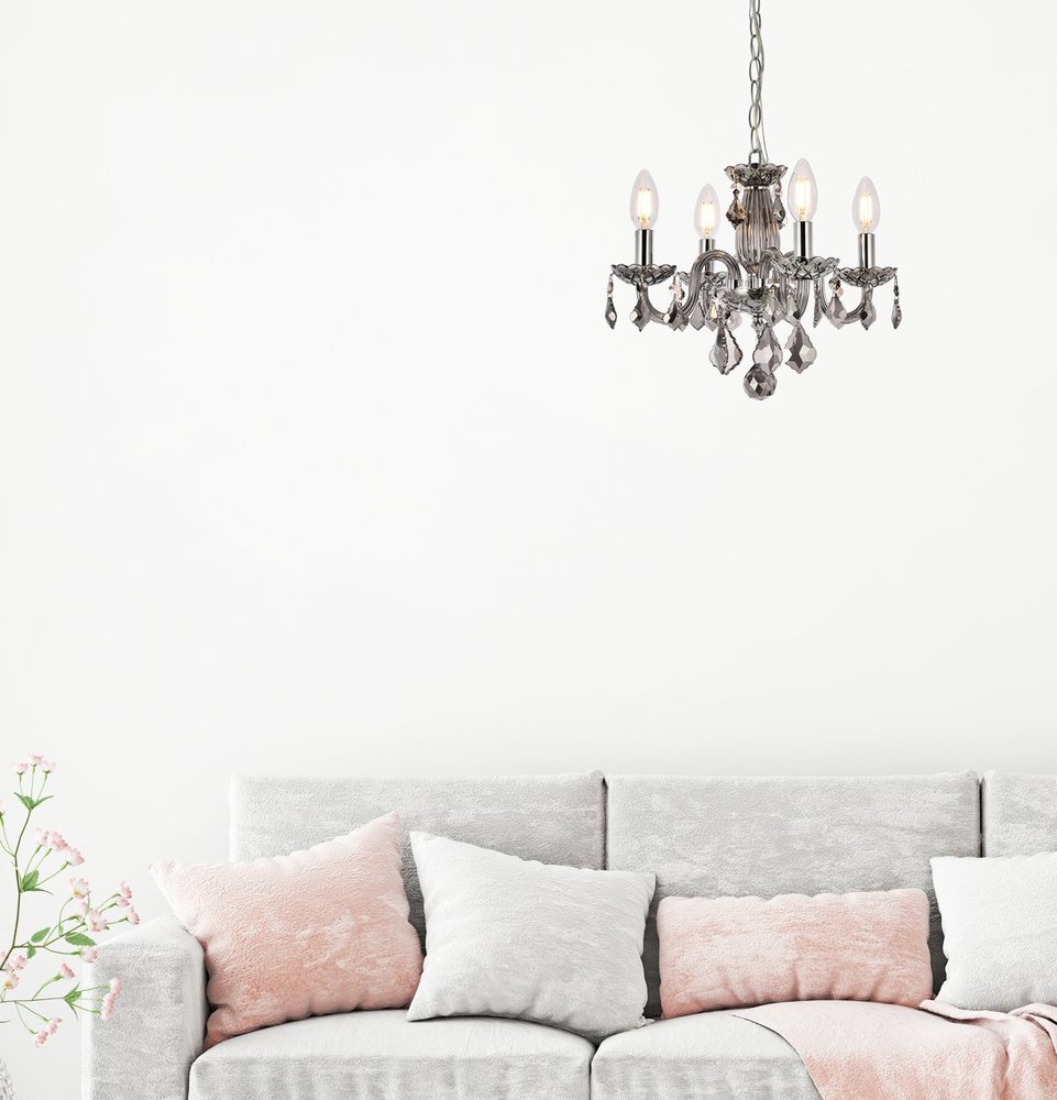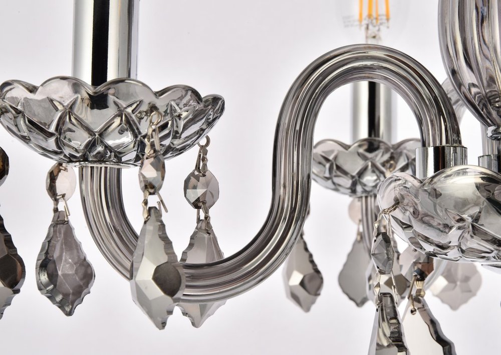 The 7804 Rococo collection was inspired by the lavish elegance of 18th century France, known for its graceful curves and light colors. The steel frame, available in an array of finishes, is highlighted by curved glass arms, a glass vase, and glass holders for the candelabra bulbs. Dangling from the delicately etched glass plates on three levels are royal-cut octagon and pendeloque crystals. It all comes together with a faceted glass sphere at the bottom. Optional shades of acrylic and organza add coziness to the glam. Petite in size yet grand in appearance, Rococo hanging pendants are perfect for enhancing the décor of smaller areas in your home.
