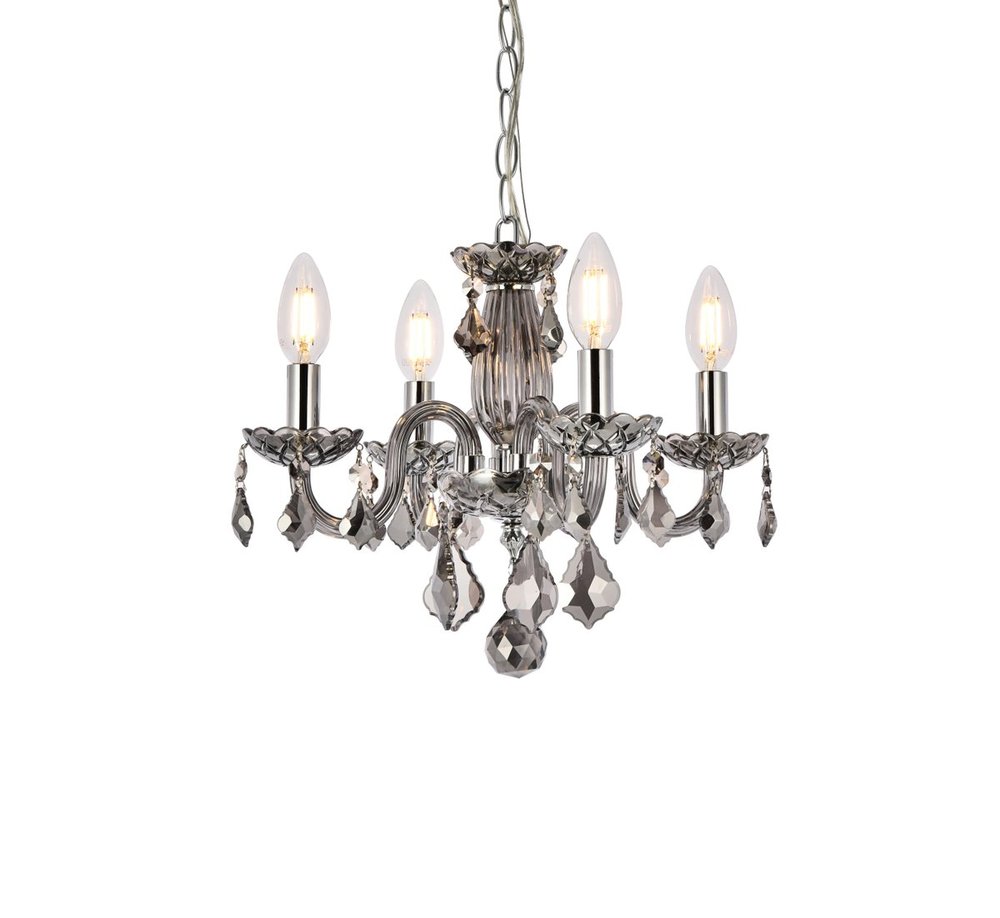 Steel frame withsilver-shade finish is highlighted by curved glass arms, a glass vase, and glass holders for the 4 candelabra bulbs