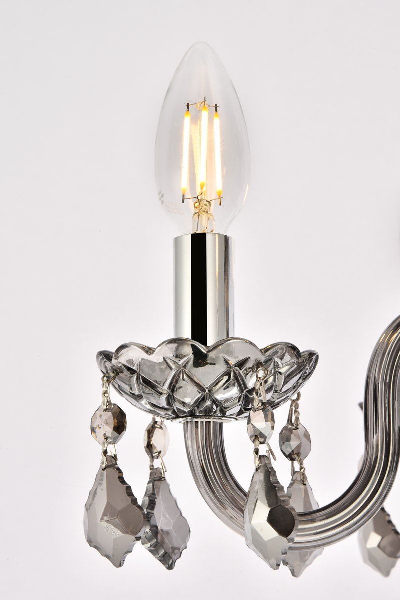 Silver-shade (grey) royal-cut octagon and pendeloque crystals dangle from three levels of delicately etched glass plates