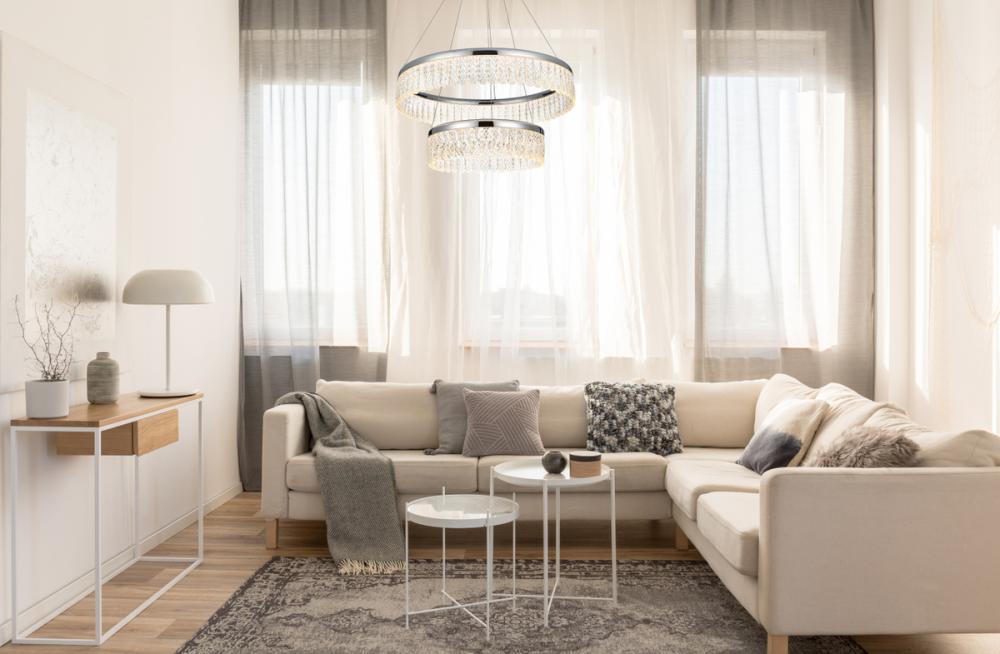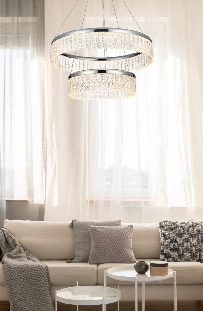 Our 24-inch Chandelier features two ring tiers, each adorned with crystals through which the light is gracefully illuminated, creating a captivating interplay of radiance and elegance in your space.