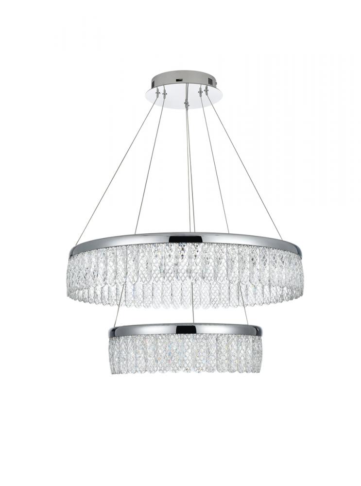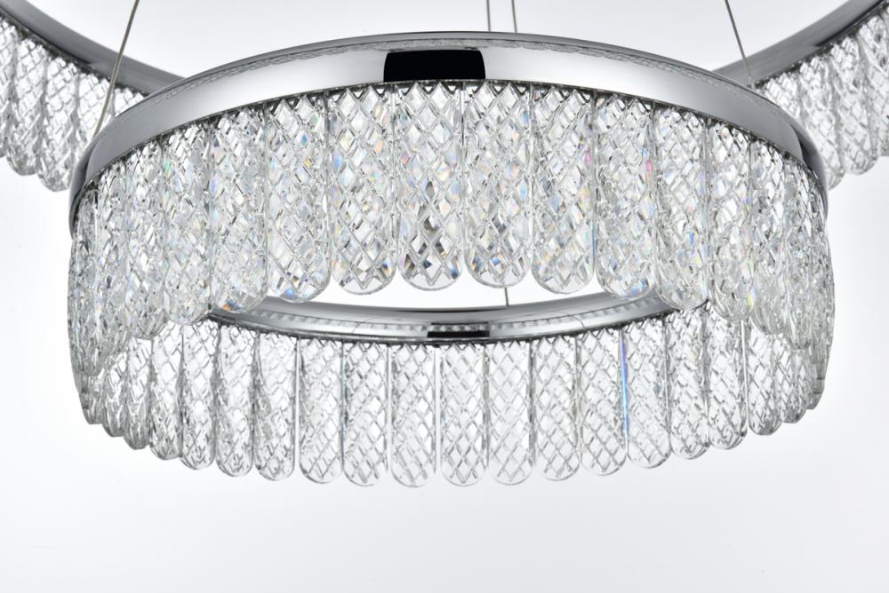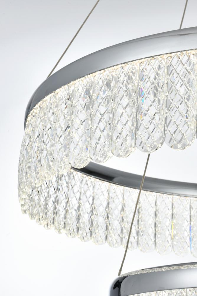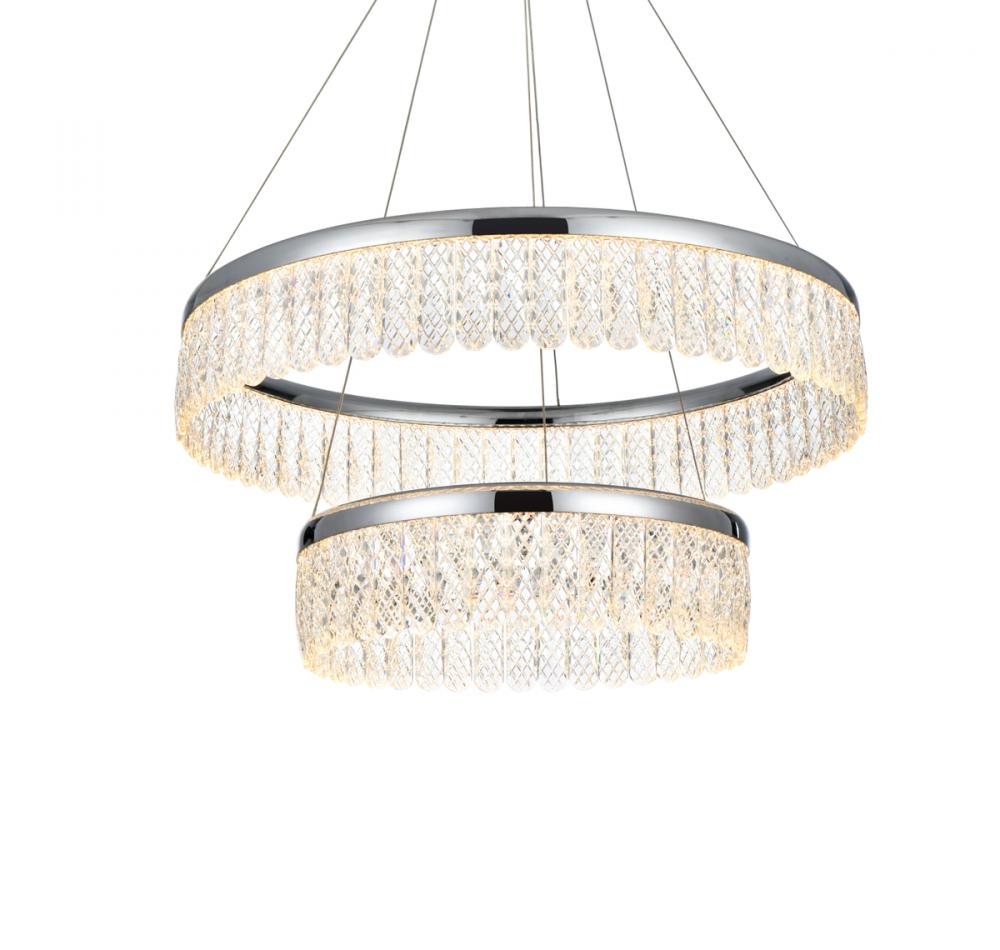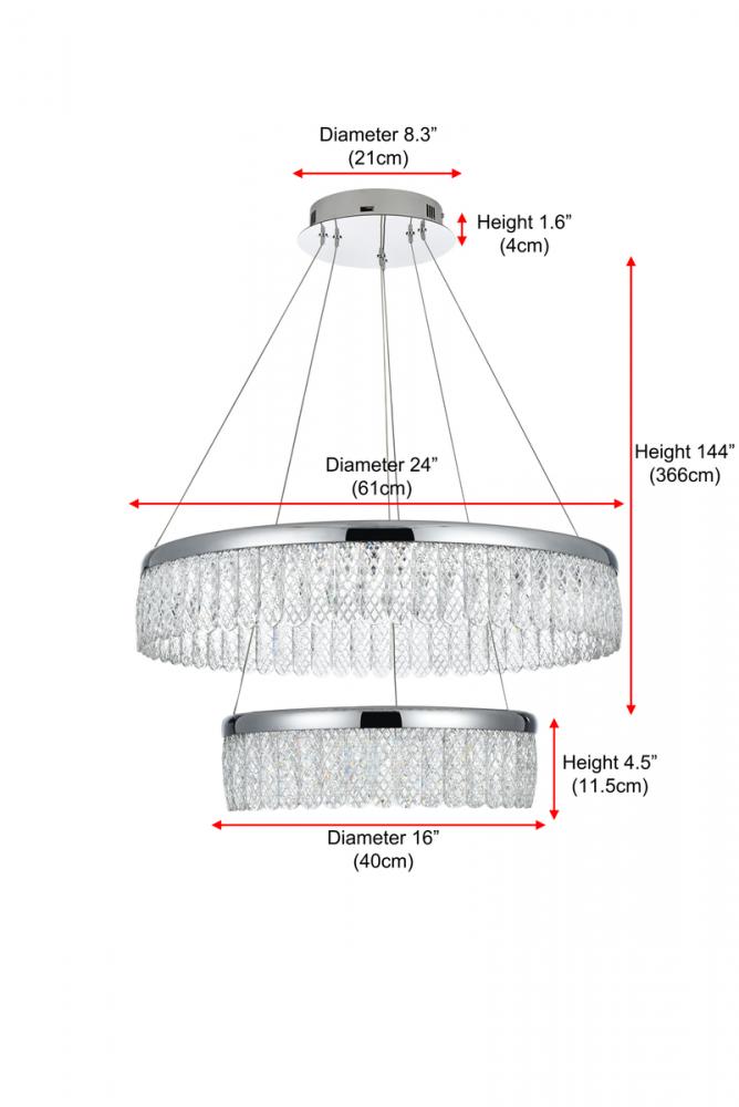 Illuminate your space with the Rune 24 inch LED chandelier, boasting two tiers gracefully adorned with crystals through which the light is elegantly diffused, creating a captivating interplay of radiance and elegance. The integrated LED lights provide energy-efficient and enduring brightness, seamlessly blending modern design with functional efficiency. Meticulously crafted from iron and aluminum, this chandelier exudes modern sophistication while ensuring durability. The distinctive argyle design of the royal cut crystals adds a touch of opulence, while the discreet toggle switch on the canopy provides convenient control, allowing you to effortlessly tailor the lighting settings to suit your preferences. Elevate your home with this versatile and elegant lighting solution. with a simple flick, effortlessly transition between three distinct color temperatures—3000K for warm and cozy moments, 4500K for a balanced ambiance, and 6000K for a crisp, invigorating brightness. This innovative toggle switch empowers you to set the mood and adapt the lighting to suit various occasions. Whether you seek a relaxed evening glow, a neutral and focused atmosphere, or a vibrant and energizing radiance, our chandelier provides the flexibility to cater to your preferences.