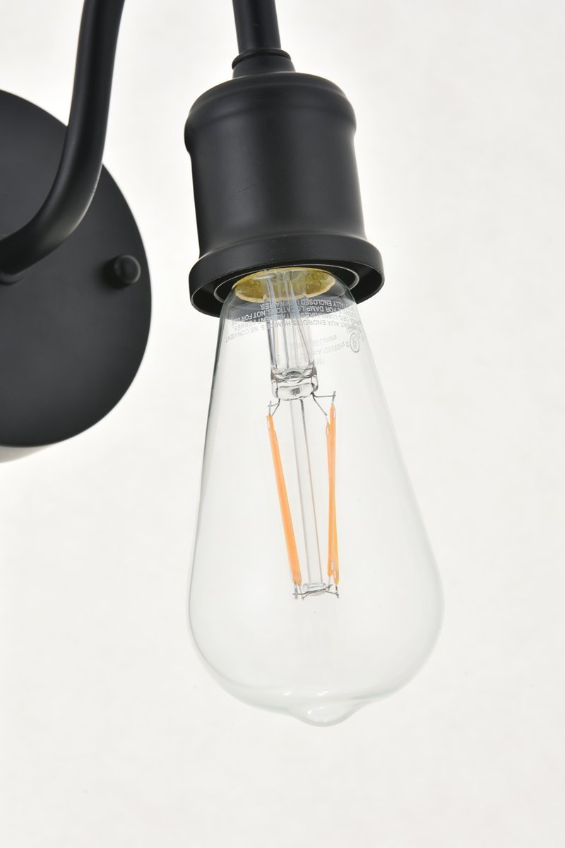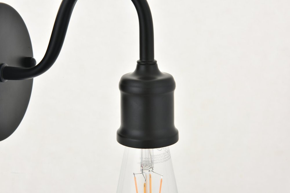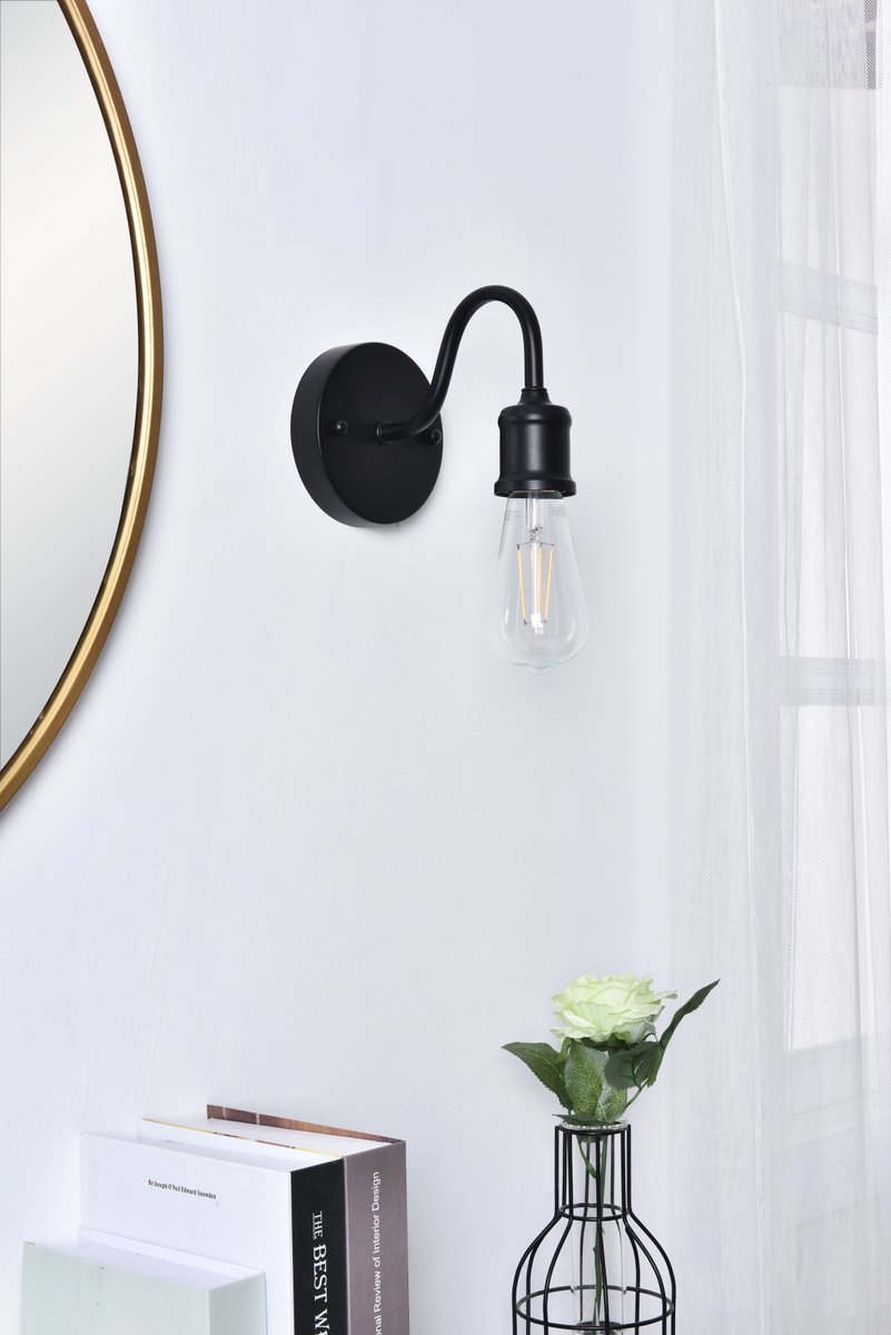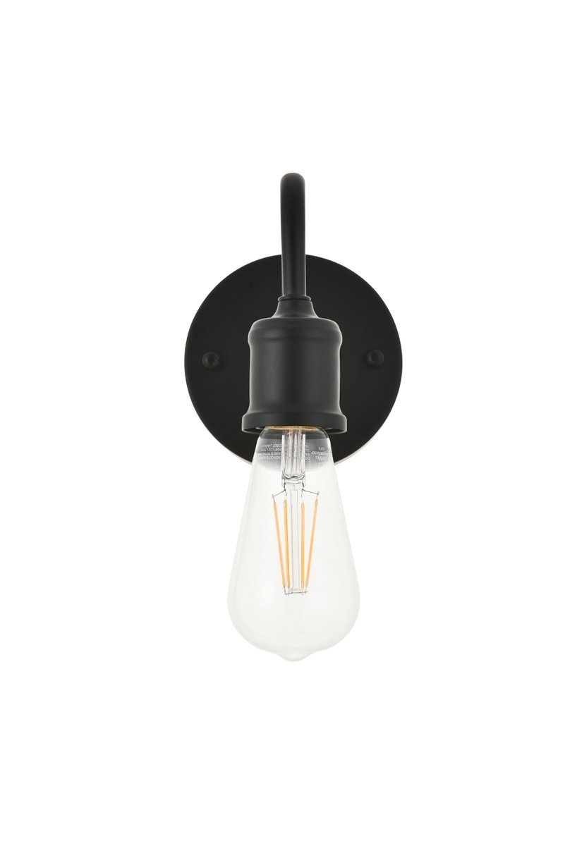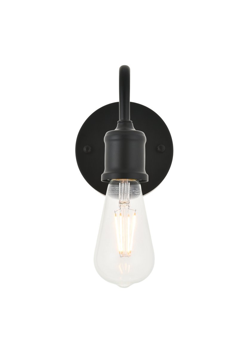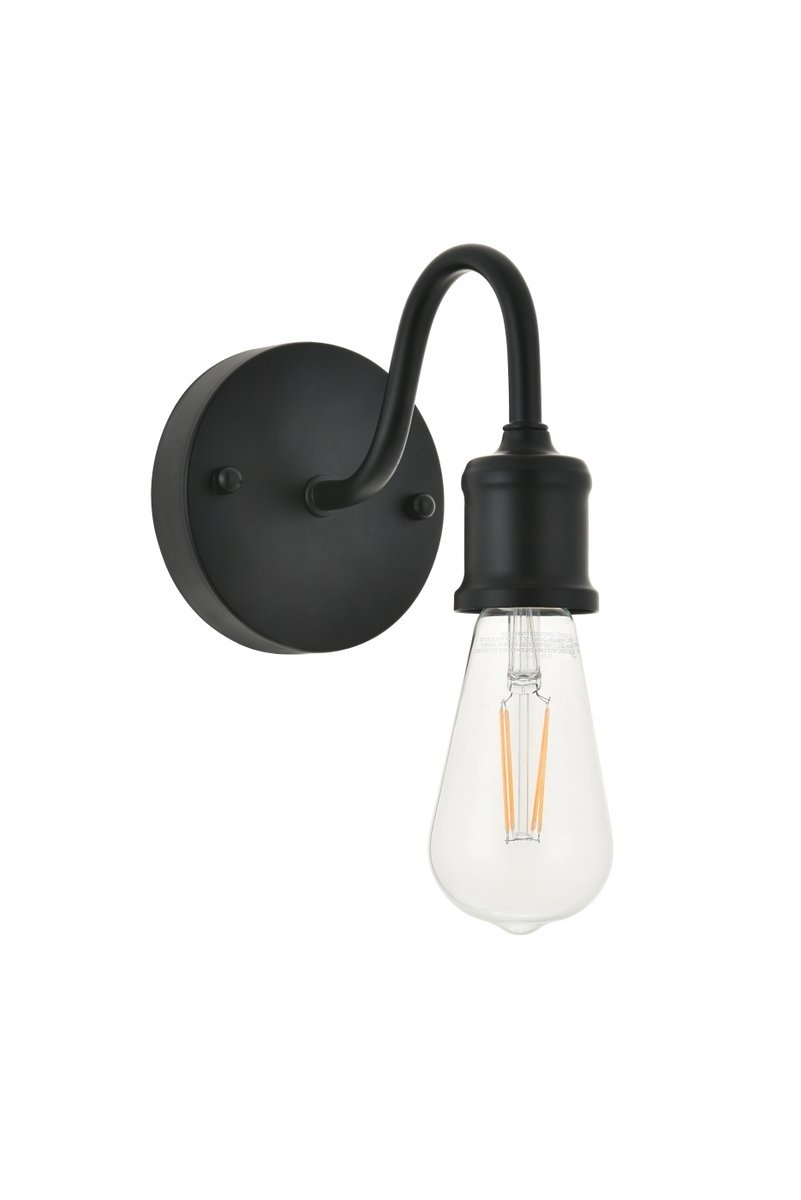 Black finish wall sconce with an undulating arm and circular back plate