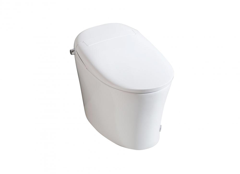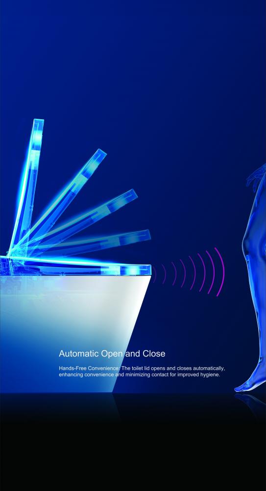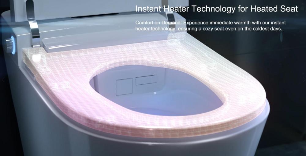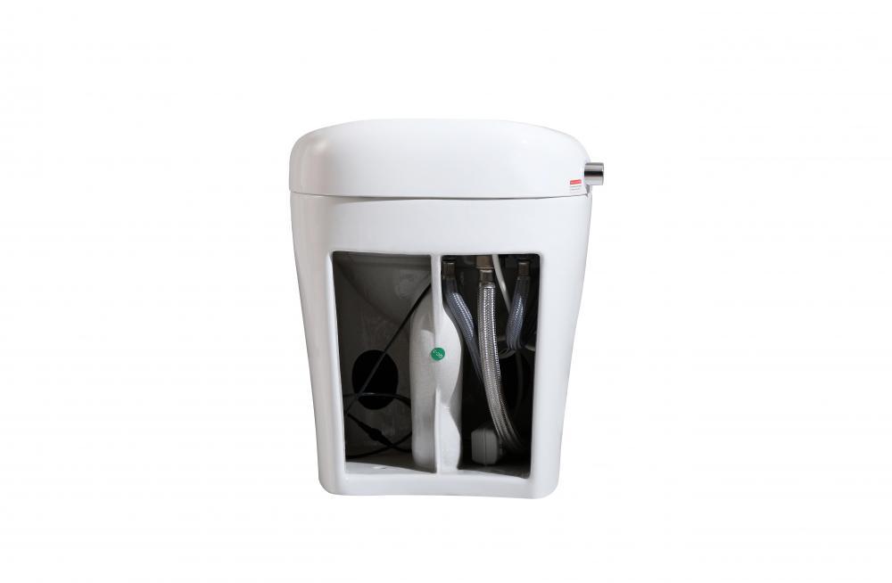 This tankless toilet features an auto open and soft-close lid for a hands free experience, for males, just gently tap at the button at the bottom of the base to lift the toilet seat, tap once more for a powerful flush.