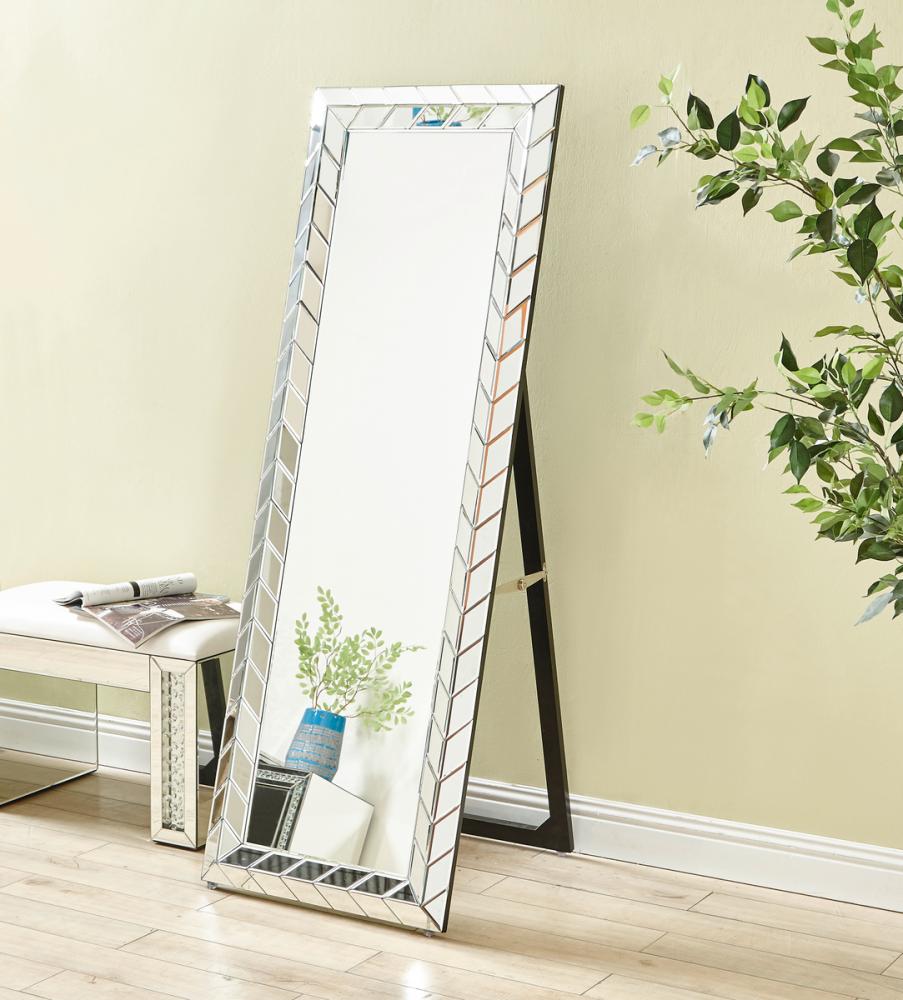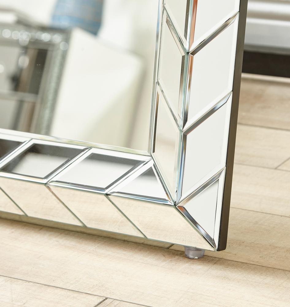 Make a striking statement in your home or office with this stunning contempo style clear mirror. Featuring dozens of expertly cut, beveled edge mirror pieces, layered together to create a bold, yet elegant textured look, you can adorn any promintnt wall with this dazzling contemporary mirror and be sure to catch people’s attention. · Contempo style clear mirror · Mirrors and all surrounding panels are made with beveled edges ·