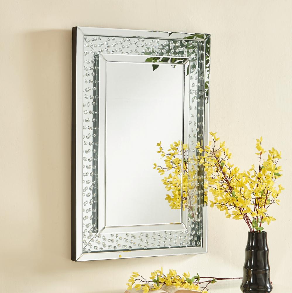 The Sparkle collection has crystal gems all over inside , crystals and silver mirror reflect shine. It combine both the function and decoration to set your house. Make a striking statement in your home or office with this stunning contempo style clear mirror. Featuring dozens of expertly cut, beveled edge mirror pieces, layered together to create a bold, yet elegant textured look, you can adorn any promintnt wall with this dazzling contemporary mirror and be sure to catch people’s attention. · Contempo rectangular sunburst style clear mirror · Mirrors and all surrounding panels are made with beveled edges