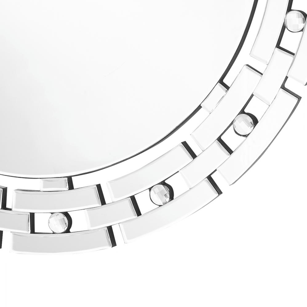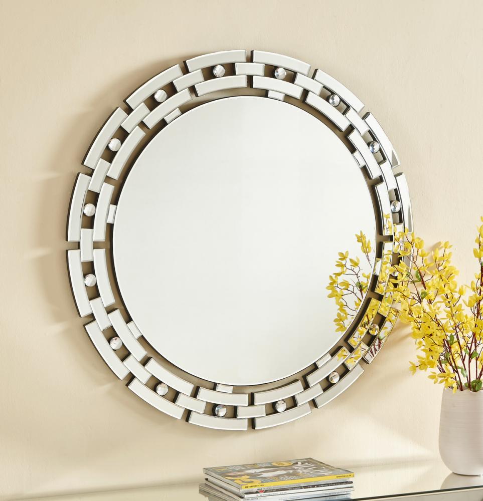 Make a striking statement in your home or office with this stunning contempo style clear mirror. Featuring dozens of expertly cut, beveled edge mirror pieces, layered together to create a bold, yet elegant textured look, you can adorn any promintnt wall with this dazzling contemporary mirror and be sure to catch people’s attention. · Contempo round sunburst style clear mirror · Mirrors and all surrounding panels are made with beveled edges.