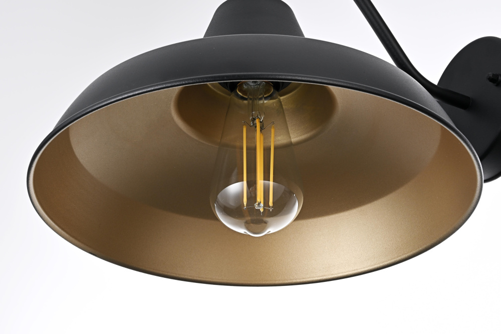This outdoor wall light brings a timeless barn-style aesthetic to exterior spaces, featuring a flared metal shade, curved gooseneck arm, and contrasting black-and-gold finish. The wide metal shade directs light downward, while the gold interior enhances brightness with a warm, reflective glow. Built from sturdy iron, this fixture is ETL Wet Rated for durability in porches, patios, garages, and farmhouse exteriors. The compact 5-inch round backplate provides a secure mount, and the dimmable functionality allows for adjustable brightness when paired with a compatible dimmer. Designed for a medium-base E26 bulb (not included), this fixture blends practical lighting with industrial character, making it a strong and stylish addition to any outdoor space. Built with marine-grade, corrosion-resistant aluminum, this sconce withstands coastal conditions for long-lasting durability.