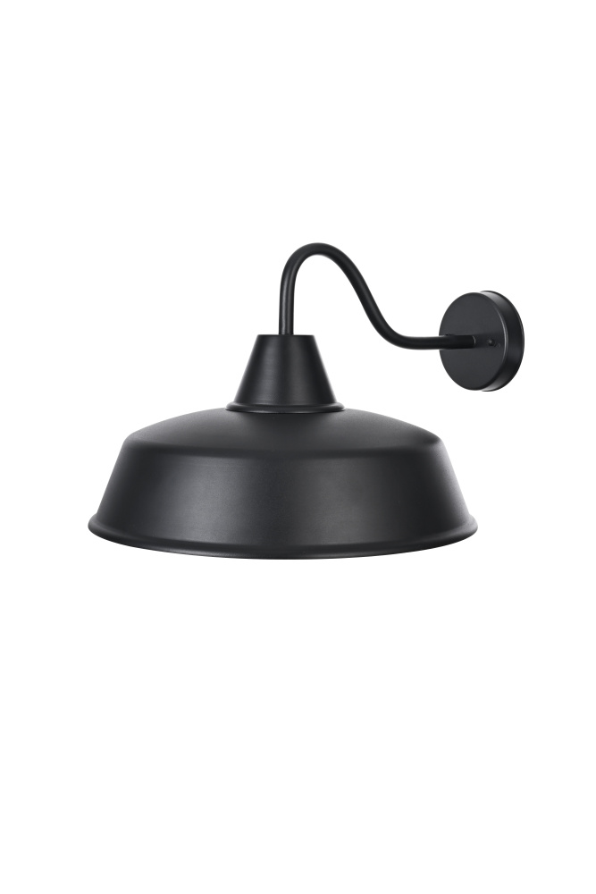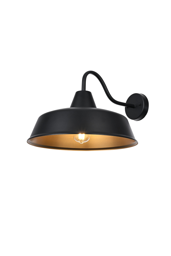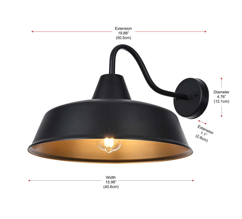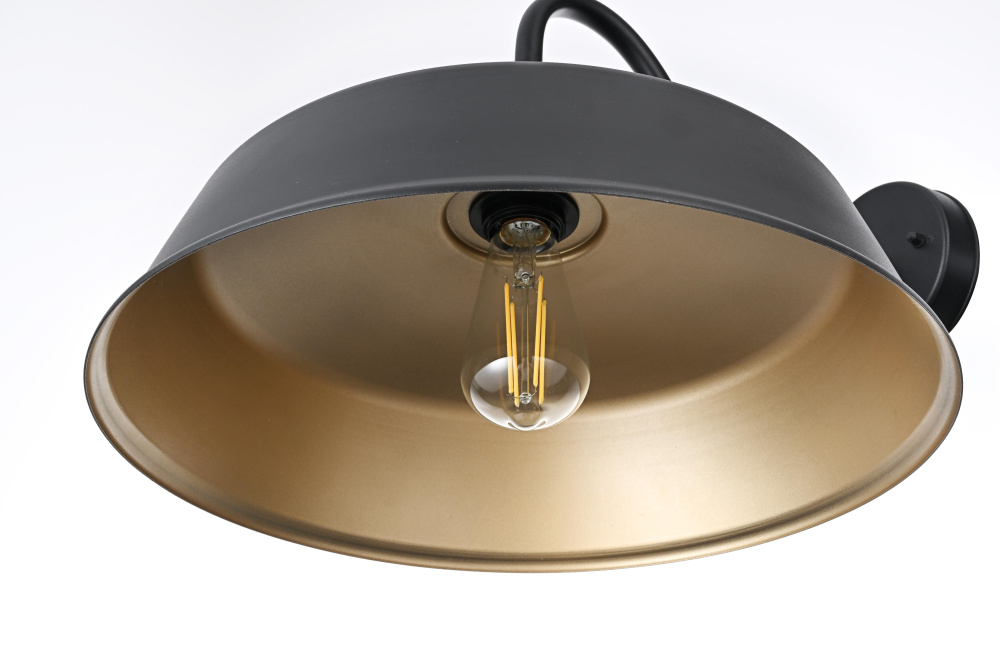 This outdoor wall light brings a timeless barn-style aesthetic to exterior spaces, featuring a flared metal shade, curved gooseneck arm, and contrasting black-and-gold finish. The wide metal shade directs light downward, while the gold interior enhances brightness with a warm, reflective glow. Built from sturdy iron, this fixture is ETL Wet Rated for durability in porches, patios, garages, and farmhouse exteriors. The compact 5-inch round backplate provides a secure mount, and the dimmable functionality allows for adjustable brightness when paired with a compatible dimmer. Designed for a medium-base E26 bulb (not included), this fixture blends practical lighting with industrial character, making it a strong and stylish addition to any outdoor space. Built with marine-grade, corrosion-resistant aluminum, this sconce withstands coastal conditions for long-lasting durability.