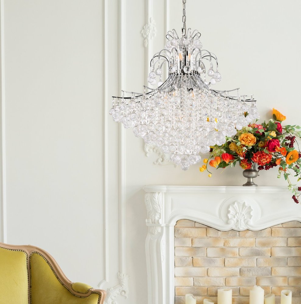 Lamp features a diameter of 31 inches, a height of 35 inches, and requires 15 candelabra bulbs