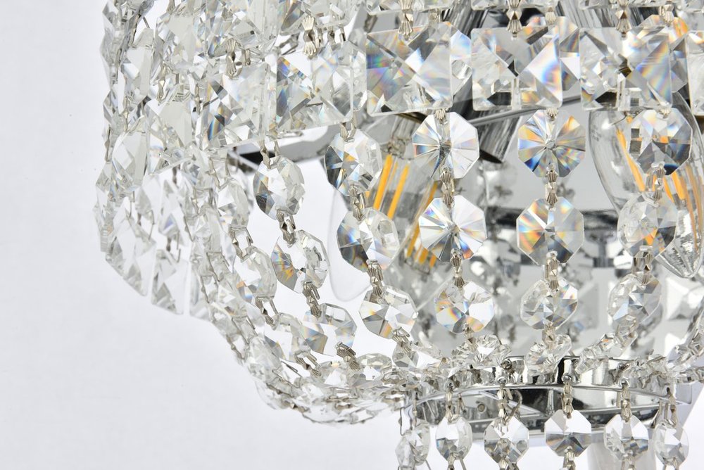 The Tranquil collection of wall sconces is everything you could imagine in the most decadent of lighting for your home. Captivating and serene, the radiance of this masterpiece will make you feel like a waterfall of lustrous sparkle enraptures you. Chrome-finished bands of exquisite emerald-cut crystals are finished off with mesmerizing spherical and droplet gems. These hypnotizing fixtures will add a touch of panache to your kitchen, dining room, foyer, or bedroom.