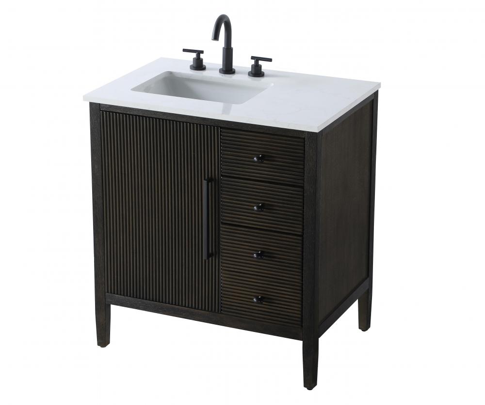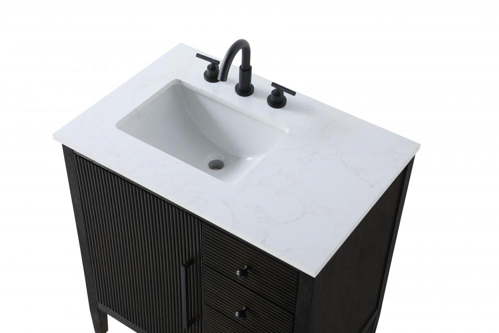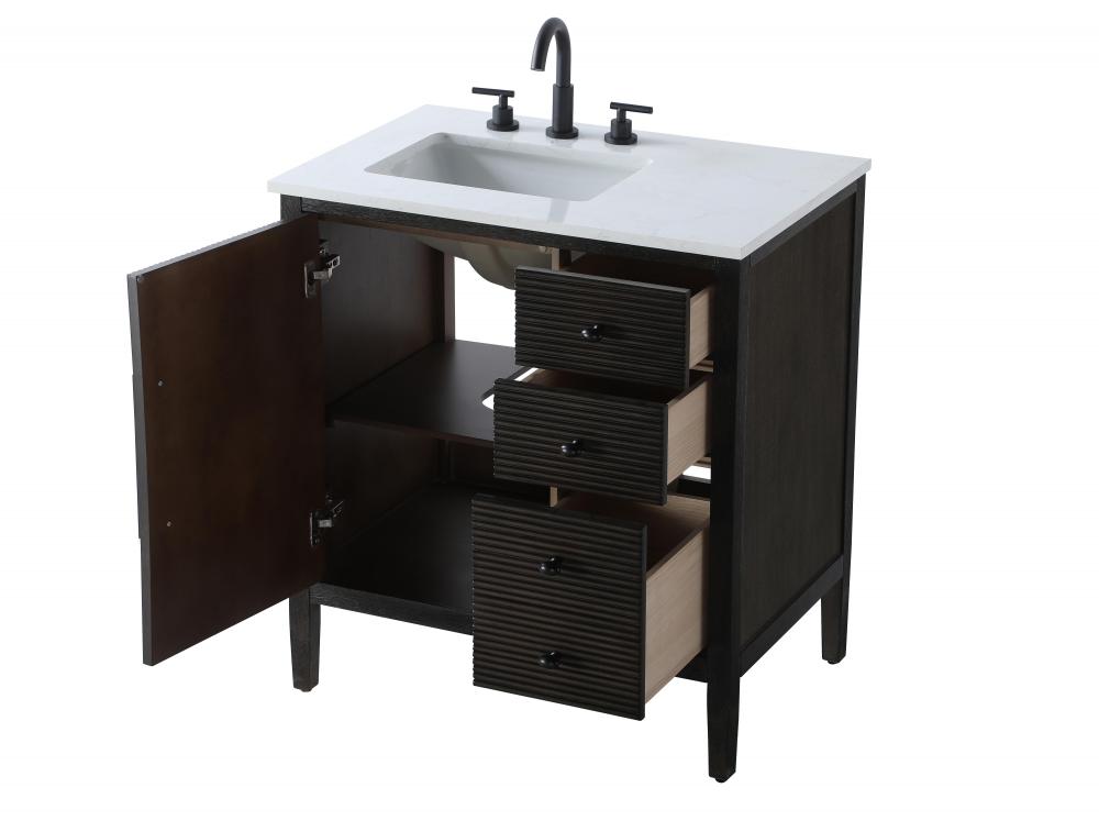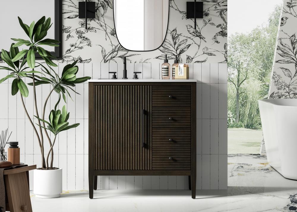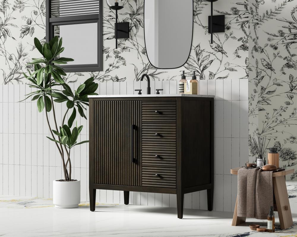 Designed with transitional elegance in mind, this bathroom vanity seamlessly blends traditional elements with modern functionality. Available in five stunning finishes, from the clean sophistication of Crisp White to the natural warmth of Honey Oak, the fluted door and drawer panels add subtle texture and charm. The white engineered marble countertop with natural veining exudes luxury, while the soft-closing doors and drawers with sleek black metal pulls offer a quiet, refined experience. Practicality is never compromised, with features like the U-shaped shelf for plumbing, deeper bottom drawer for ample storage, and pre-drilled faucet holes for easy customization. Whether your style leans modern or classic, this vanity is the perfect balance of beauty and function, appealing to customers with a taste for quality and style.