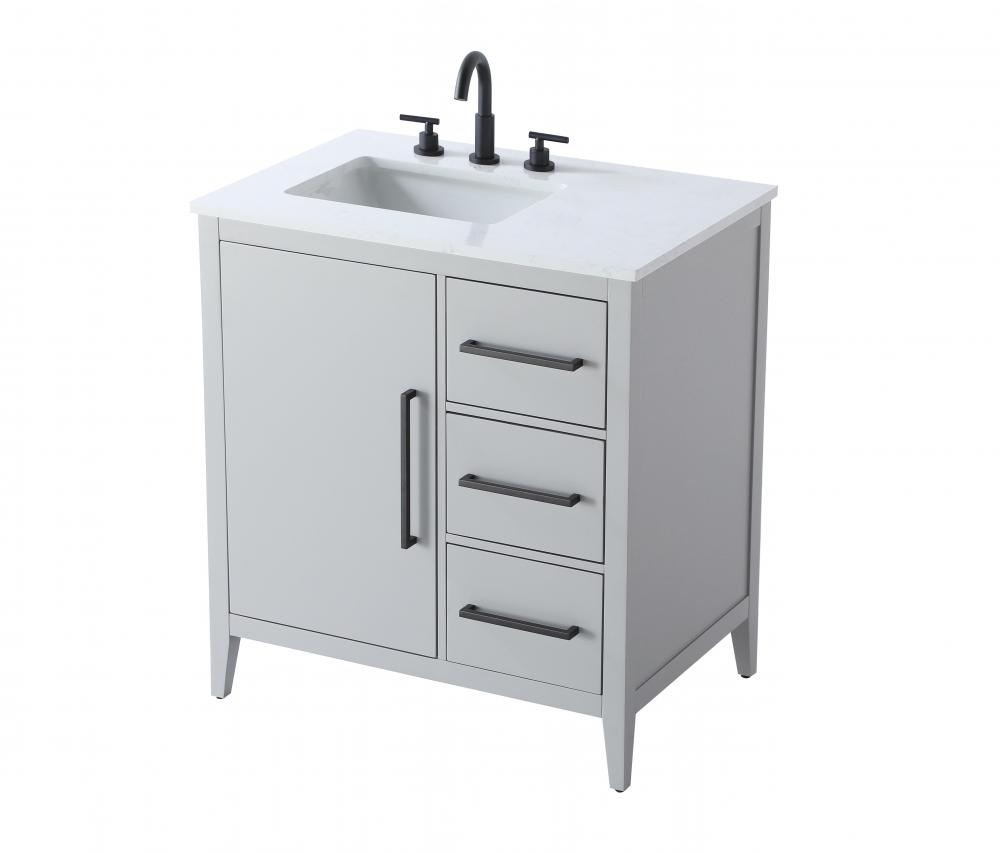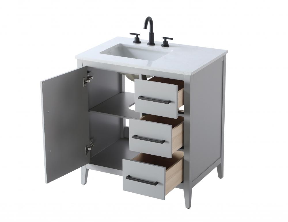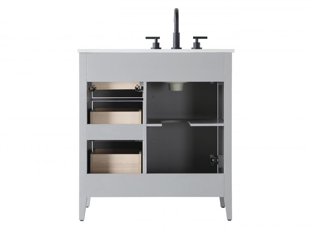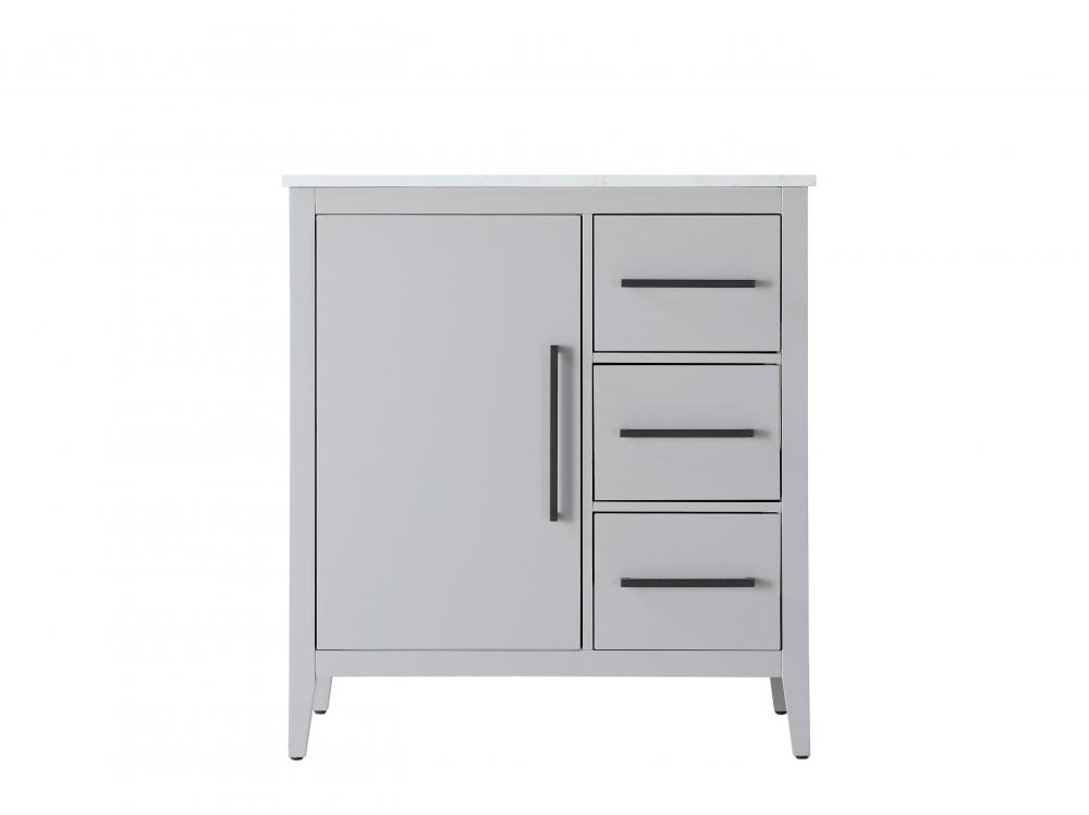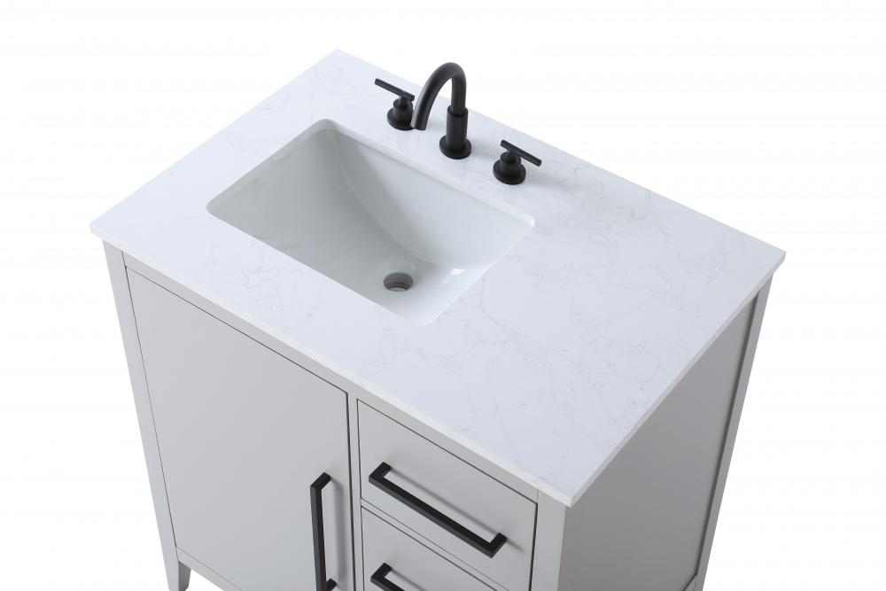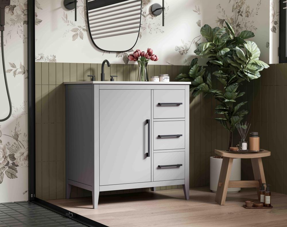 Bring both elegance and practicality to your bathroom with this transitional vanity, available in a selection of rich finishes that highlight the beauty of faux wood grain in shades of mocha, chestnut, and honey, along with classic white and modern grey. The flat door panels and sleek black metal pulls create a minimalist yet refined aesthetic, while the soft-closing drawers and tapered legs with levelers provide smooth, functional operation. Topped with a luxurious white engineered marble countertop and featuring a porcelain sink, this vanity combines timeless style with modern efficiency. Thoughtfully designed with U-shaped cutout for plumbing, it offers ample storage and easy installation, making it the perfect centerpiece for any bathroom.
