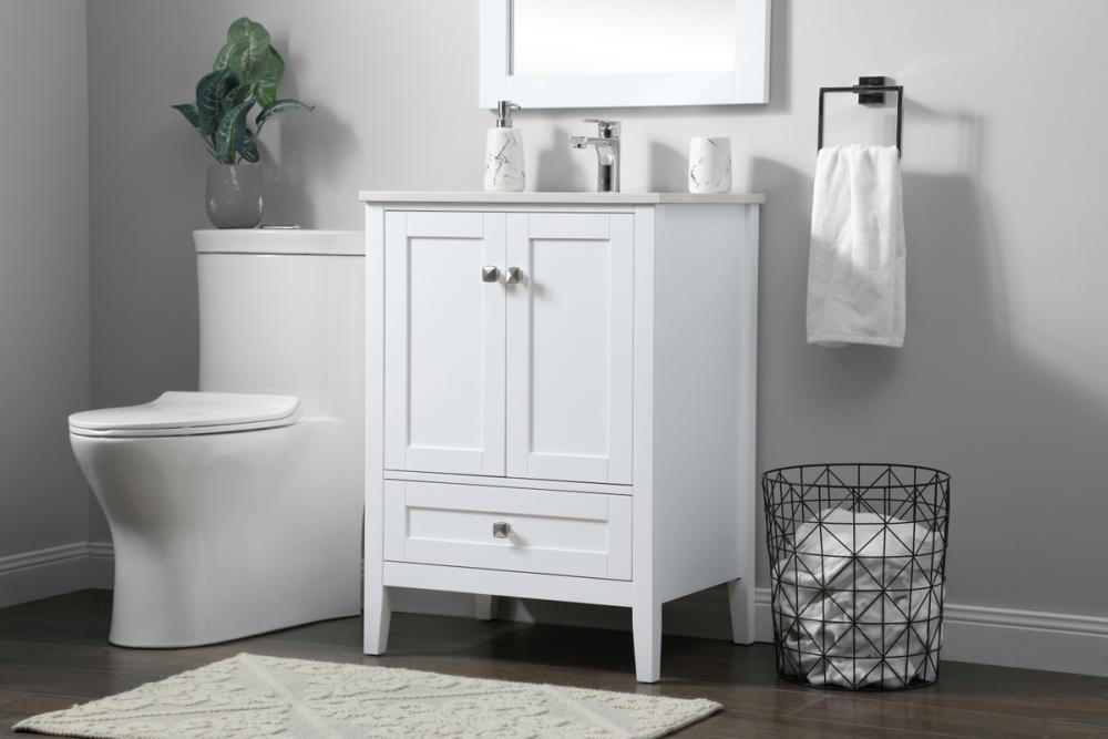 Sleek and space-efficient, our 24-inch vanity combines modern design with functionality, featuring a spacious cabinet and soft-close hinges for stylish and seamless storage.