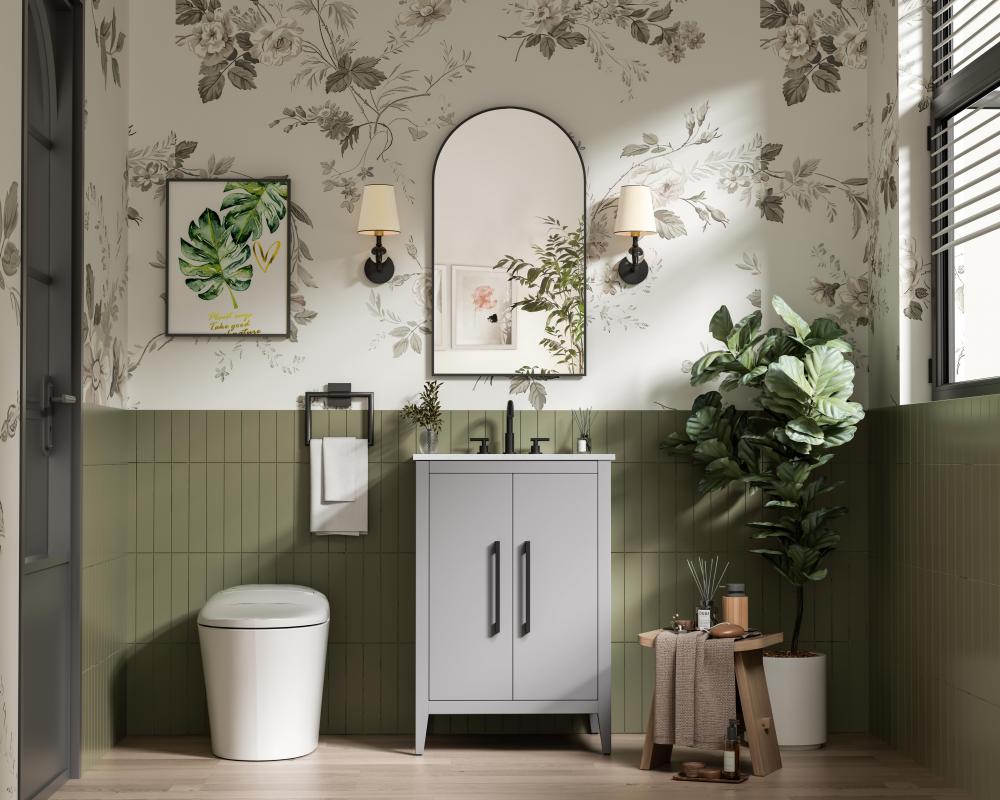 The vanity stands on tapered 5-inch solid wood legs with levelers for a balanced, polished look, combining modern style with practicality.