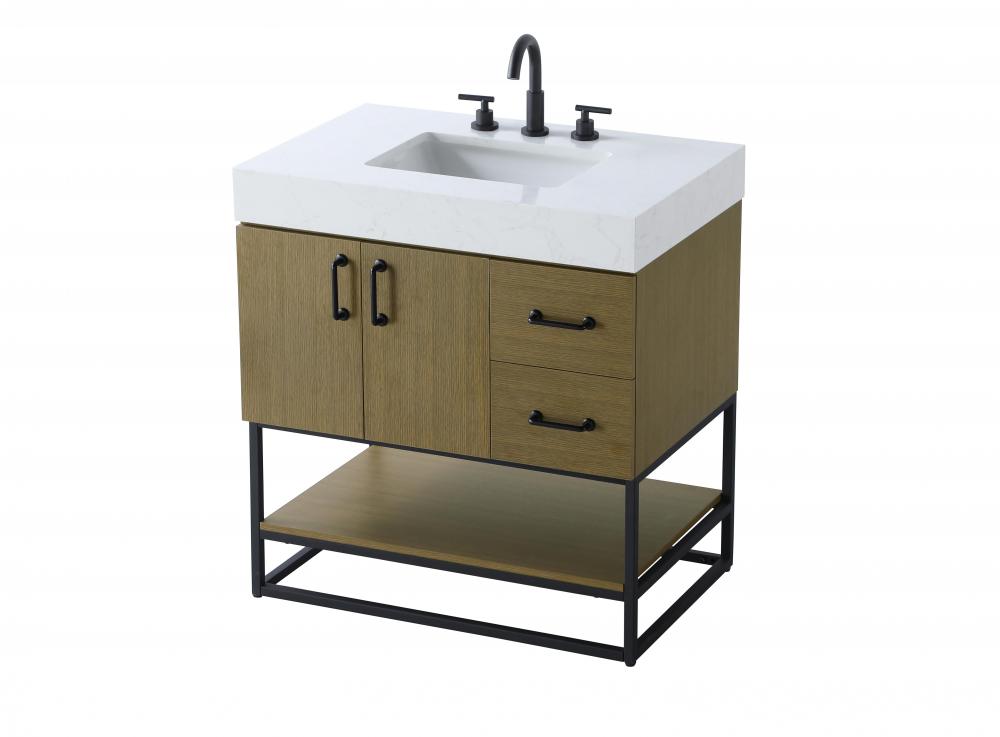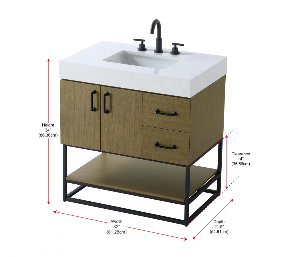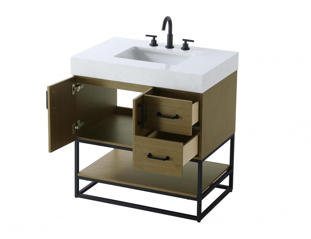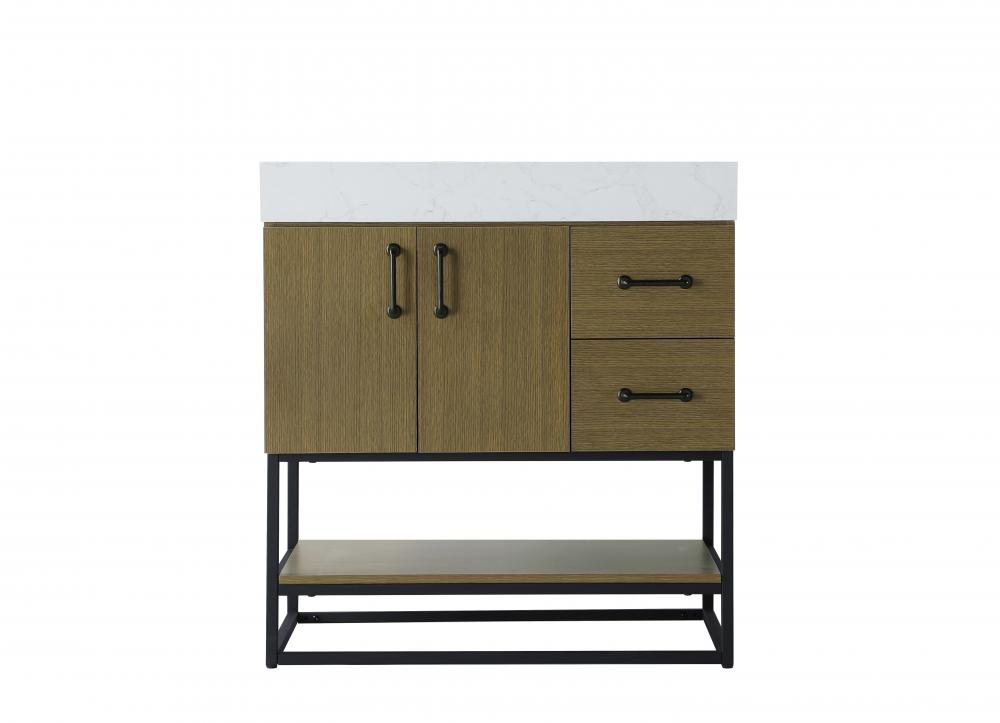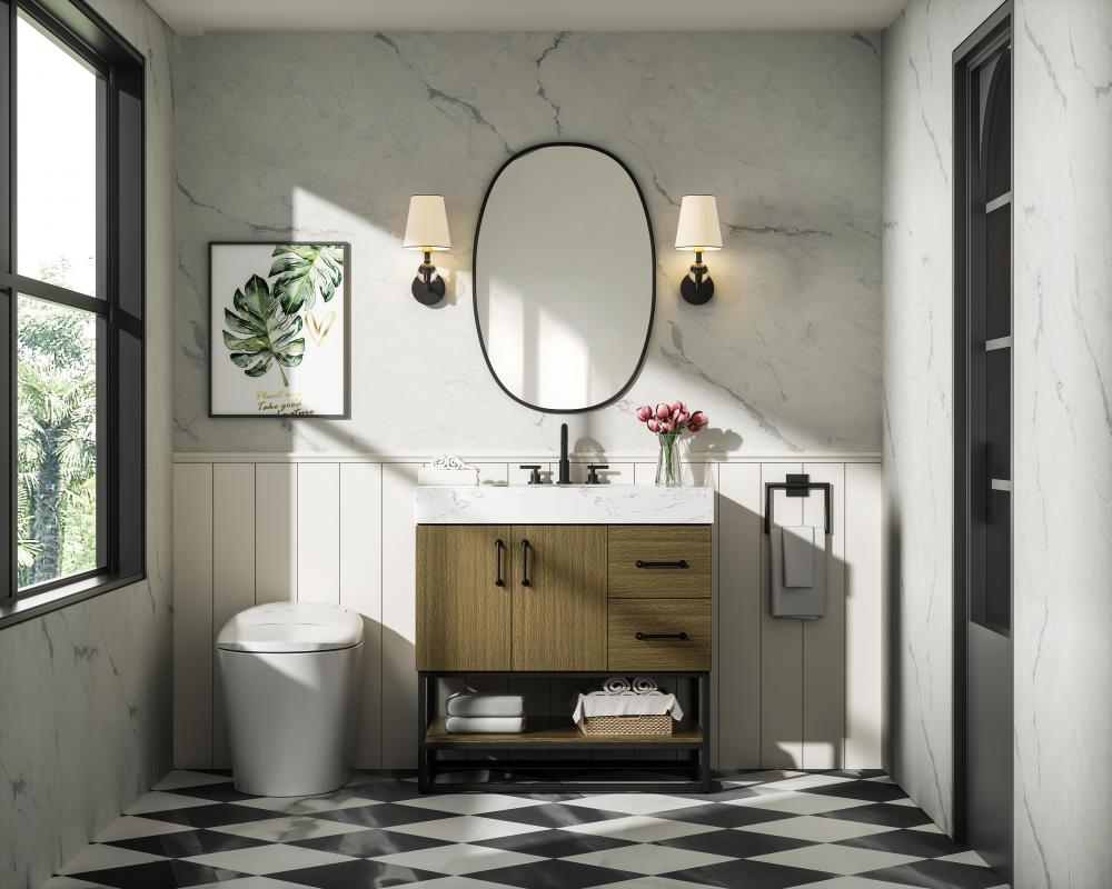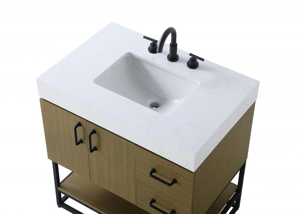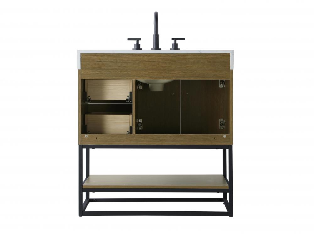 Upgrade your bathroom with this stylish transitional vanity, available in five stunning finishes, from crisp white to warm honey brown, designed to suit a variety of decor styles. The minimalist flat door panels and open wood shelf create a functional yet visually appealing storage solution, while the slender black metal legs elevate the look with modern sophistication. The 4-inch thick white engineered marble countertop, accented with natural veining, adds a luxurious touch, perfectly complemented by soft-closing doors with sleek black metal bar pulls. Thoughtful details like the concealed overflow, back panel cutout for plumbing, and 3 pre-drilled holes for an 8-inch faucet make installation easy and efficient. with a porcelain sink and farmhouse-inspired touches, this vanity brings both elegance and practicality to any bathroom setting.