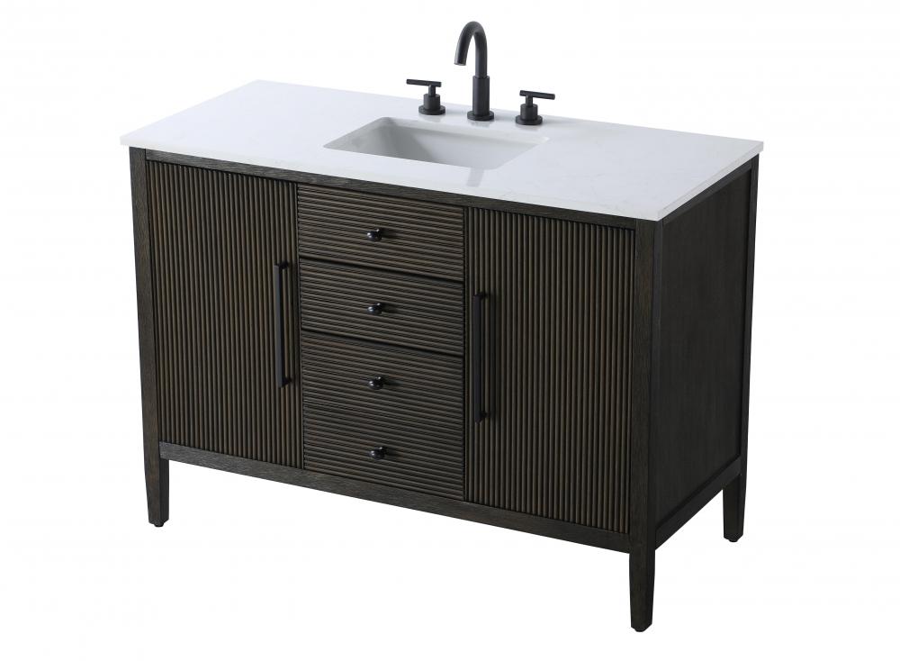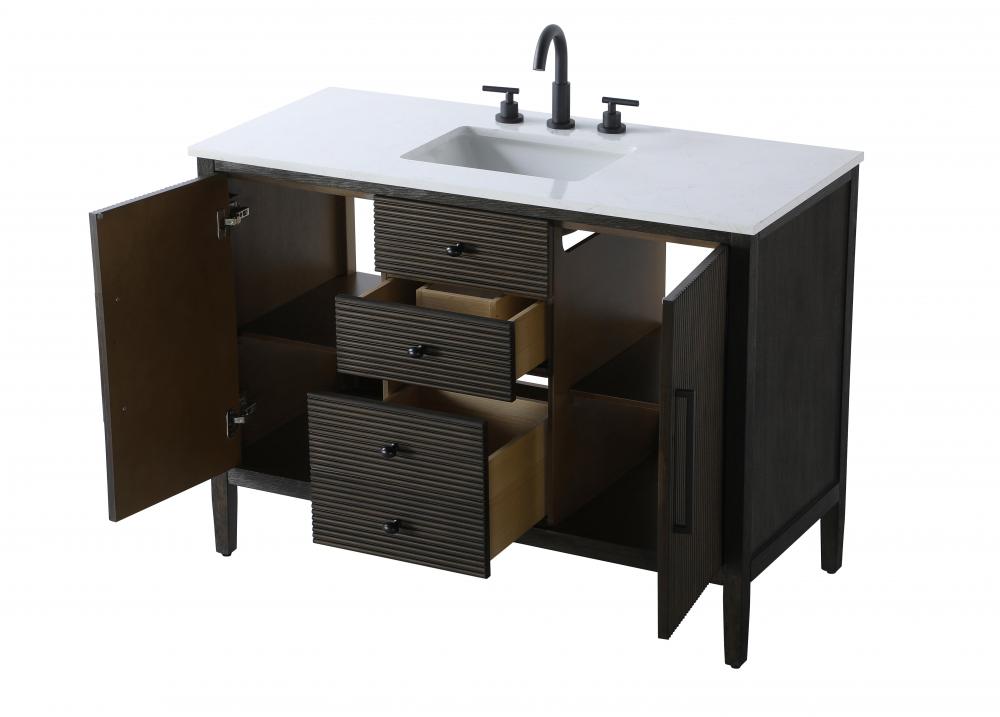 The slender black metal pulls on the doors and the oval-shaped knobs on the drawers provide sleek, modern accents, enhancing the vanity's elegant design.