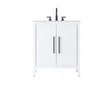 Bring both elegance and practicality to your bathroom with this transitional vanity, available in a selection of rich finishes that highlight the beauty of faux wood grain in shades of mocha, chestnut, and honey, along with classic white and modern grey. The flat door panels and sleek black metal pulls create a minimalist yet refined aesthetic, while the soft-closing drawers and tapered legs with levelers provide smooth, functional operation. Topped with a luxurious white engineered marble countertop and featuring a porcelain sink, this vanity combines timeless style with modern efficiency. Thoughtfully designed with U-shaped cutout for plumbing, it offers ample storage and easy installation, making it the perfect centerpiece for any bathroom.