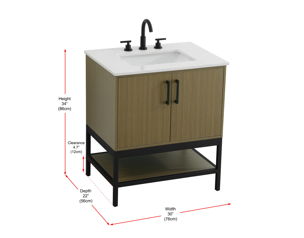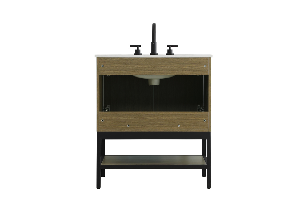 Upgrade your bathroom with this modern bathroom vanity that combines form and function effortlessly. Its sleek wood veneer cabinetry, paired with a bold black metal frame, brings a clean, contemporary vibe to any space. Designed with practicality in mind, the cabinet organizes your essentials, as well as an open lower shelf for added storage or display. The durable engineered marble countertop is built to withstand daily use, while the undermount porcelain sink ensures easy maintenance. Complete with matte black hardware and pre-drilled features for effortless installation, this vanity is the perfect centerpiece to refresh your bathroom with style and efficiency.