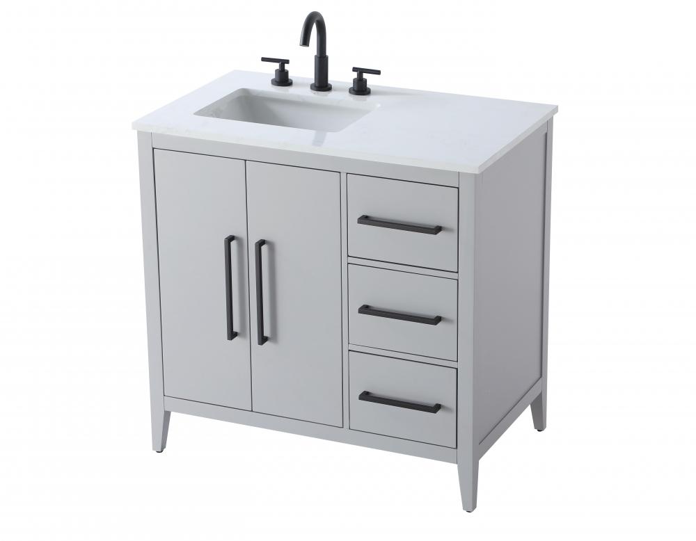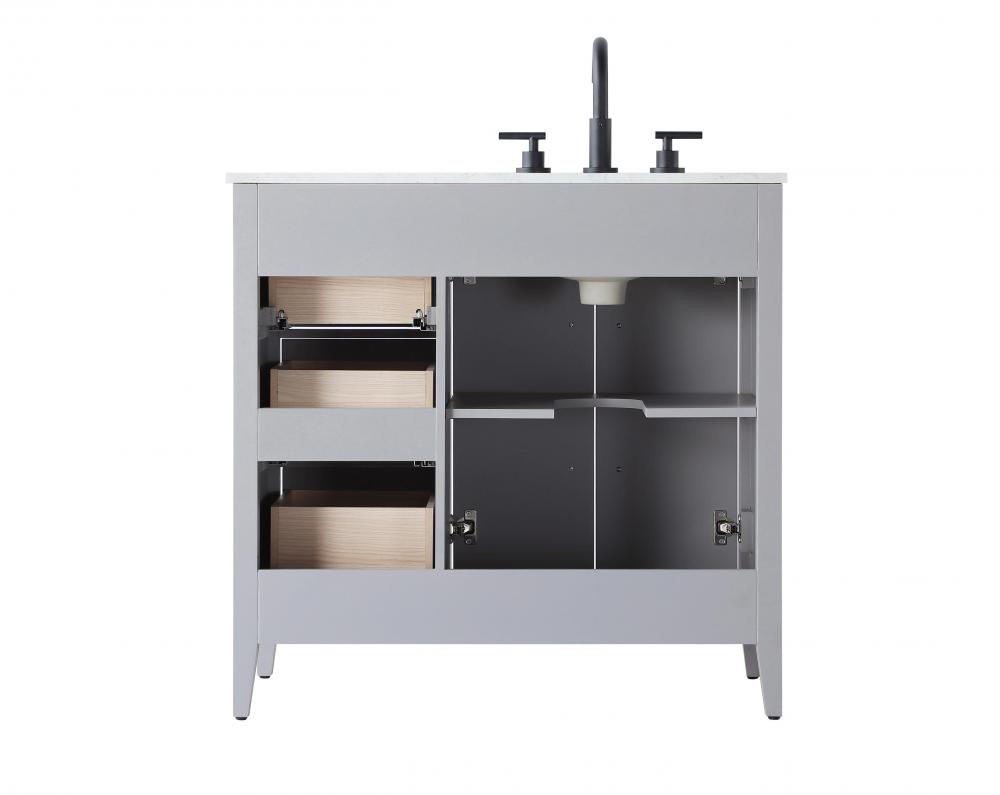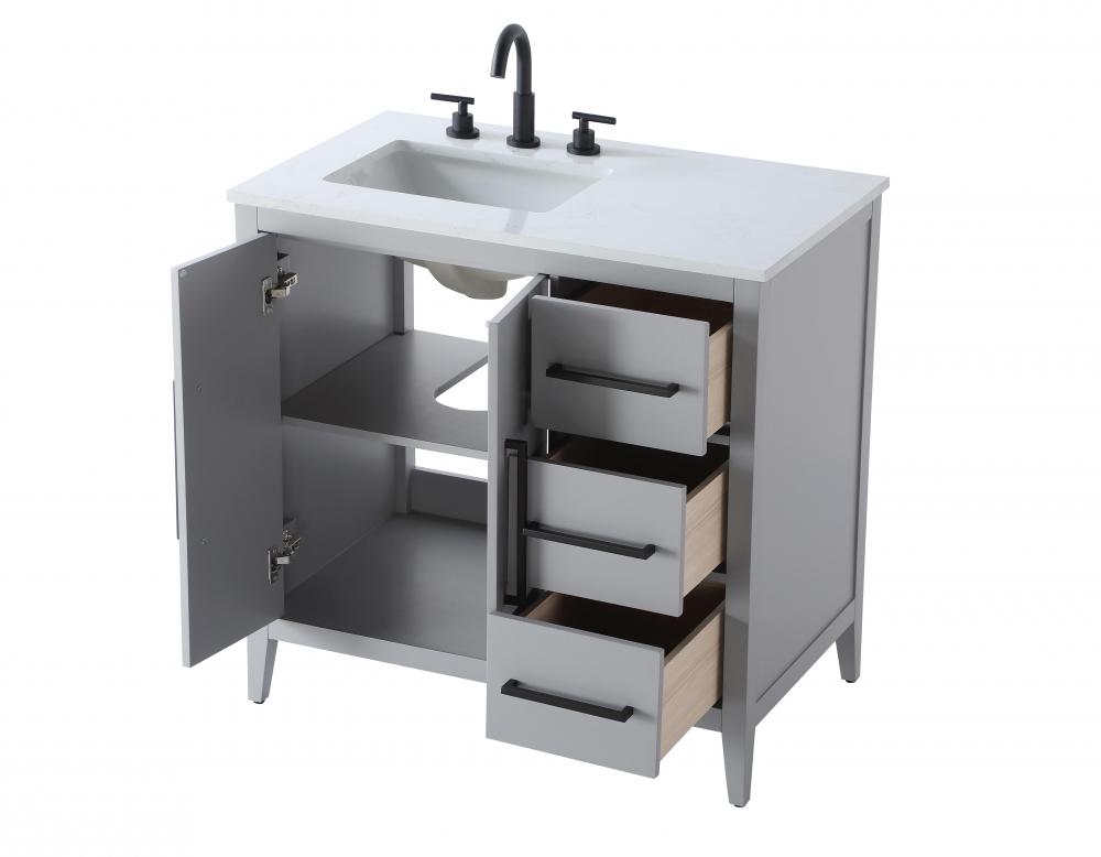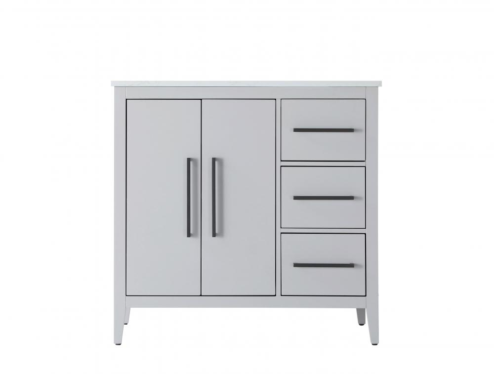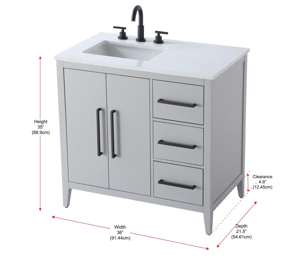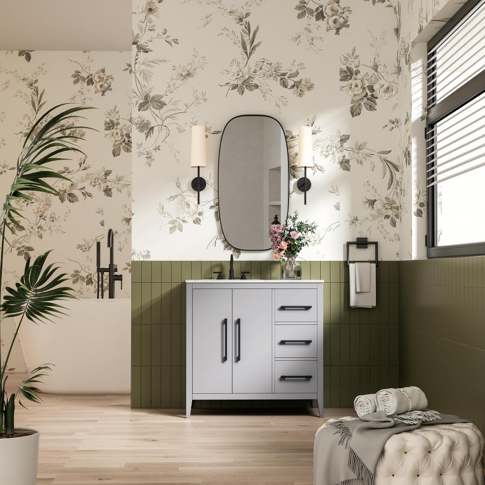 Bring both elegance and practicality to your bathroom with this transitional vanity, available in a selection of rich finishes that highlight the beauty of faux wood grain in shades of mocha, chestnut, and honey, along with classic white and modern grey. The flat door panels and sleek black metal pulls create a minimalist yet refined aesthetic, while the soft-closing drawers and tapered legs with levelers provide smooth, functional operation. Topped with a luxurious white engineered marble countertop and featuring a porcelain sink, this vanity combines timeless style with modern efficiency. Thoughtfully designed with U-shaped cutout for plumbing, it offers ample storage and easy installation, making it the perfect centerpiece for any bathroom.
