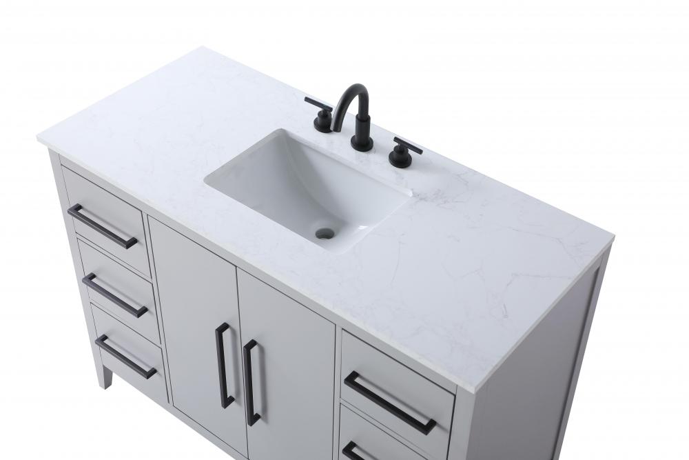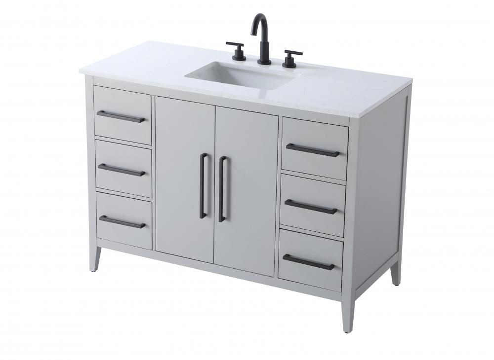 The vanity stands on tapered 5-inch solid wood legs with levelers for a balanced, polished look, combining modern style with practicality.