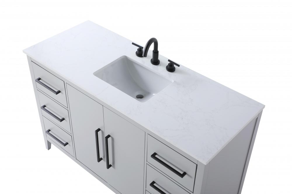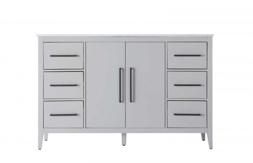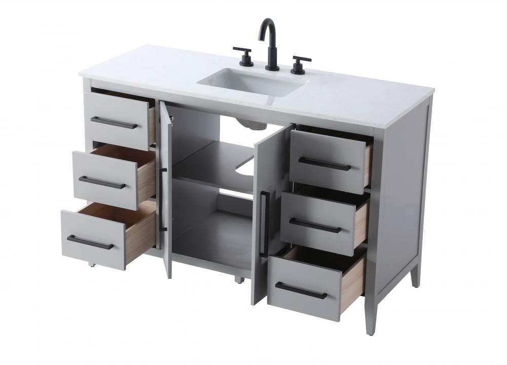 The vanity stands on tapered 5-inch solid wood legs with levelers for a balanced, polished look, combining modern style with practicality.